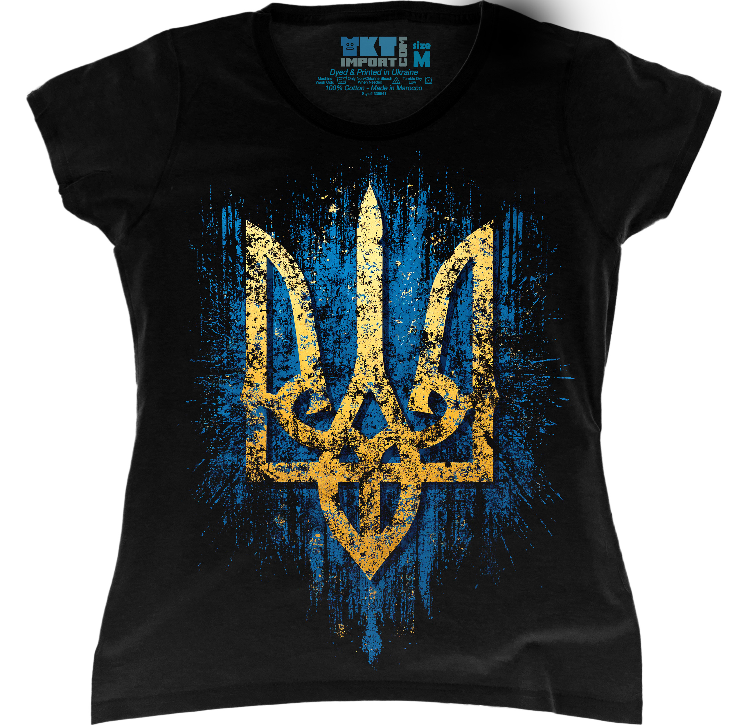 Жіноча футболка з яскравим принтом тризуба в кольорах українського прапора. Модель виглядає стильно, символічно та чудово підходить для повсякденного образу.