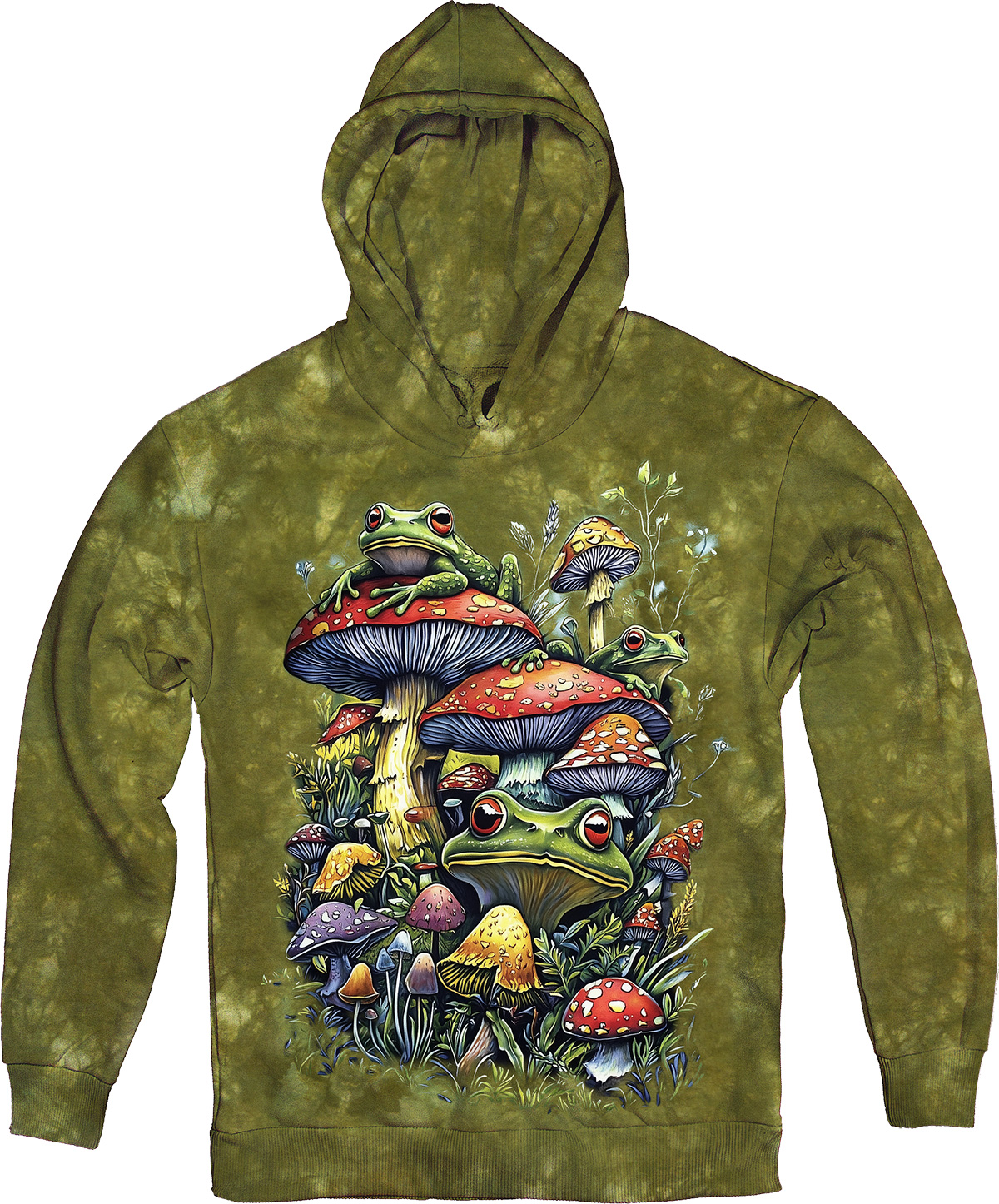 Худі з веселим дизайном жабок у фантастичному лісі грибів. Поєднання стилю, гумору та природної магії для створення унікального образу.