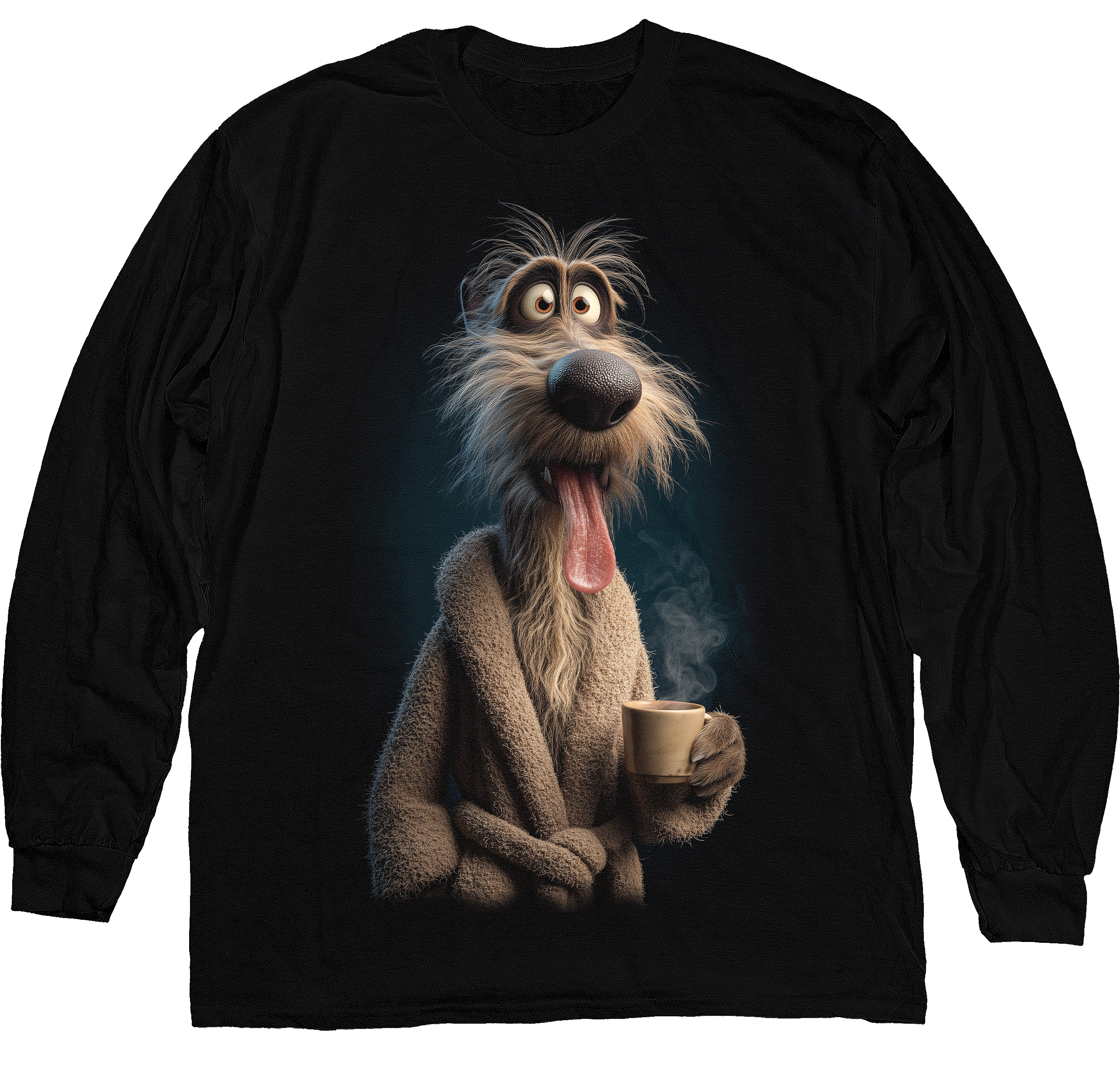 Чорний лонгслів із веселим принтом собаки у халаті з чашкою кави. Кумедний дизайн передає справжній настрій ранку — трохи розпатланий вигляд, але вже готовність до нового дня. Ідеальний вибір для тих, хто любить собак, каву та комфорт у стилі стрітстайл.