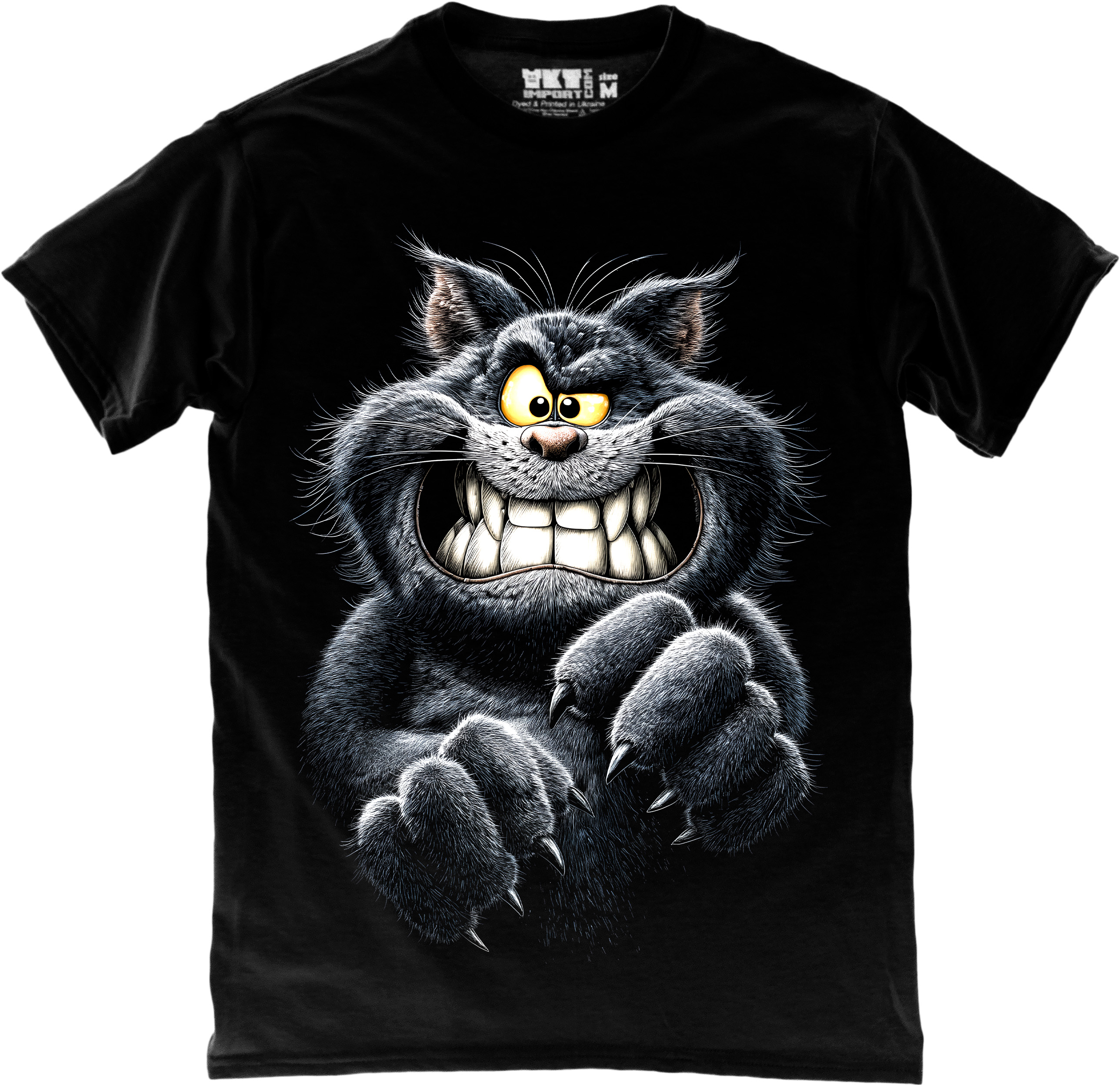 Чорна футболка з яскравим принтом пухнастого чорного кота з шаленою посмішкою та загрозливими кігтями. Ідеальний вибір для тих, хто любить виділятися, має почуття гумору та цінує стильні креативні речі. Цей дизайн додає образу драйву та харизми.