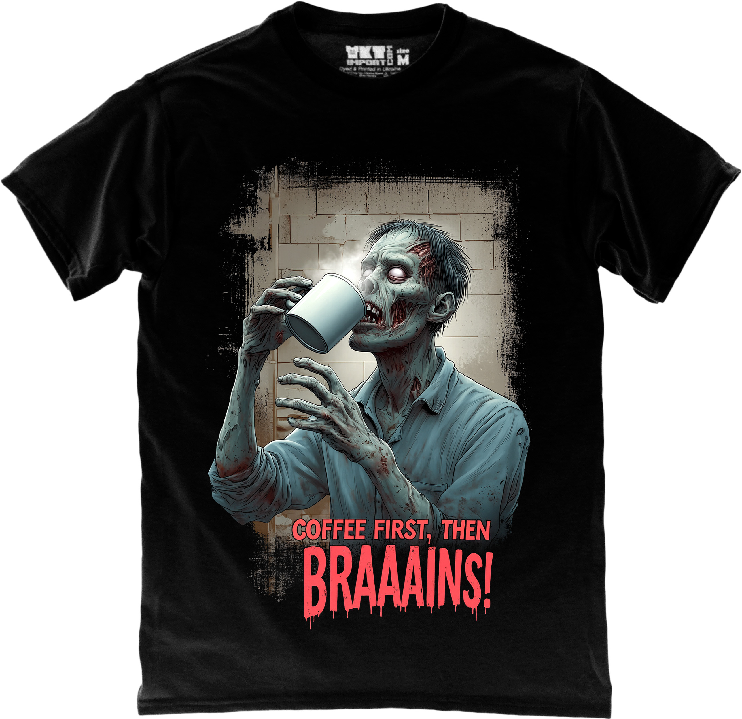 Футболка «Мізки тільки після кави» — ідеальний вибір для тих, хто не може прокинутися без чашки ароматної кави. Дизайн із кумедним зомбі, який спершу тягнеться до кави, а вже потім до мізків, додасть гумору у ваш образ. Яскравий принт, насичені кольори та зручний крій роблять цю футболку must-have для поціновувачів кави та фанів хорор-тематики.
