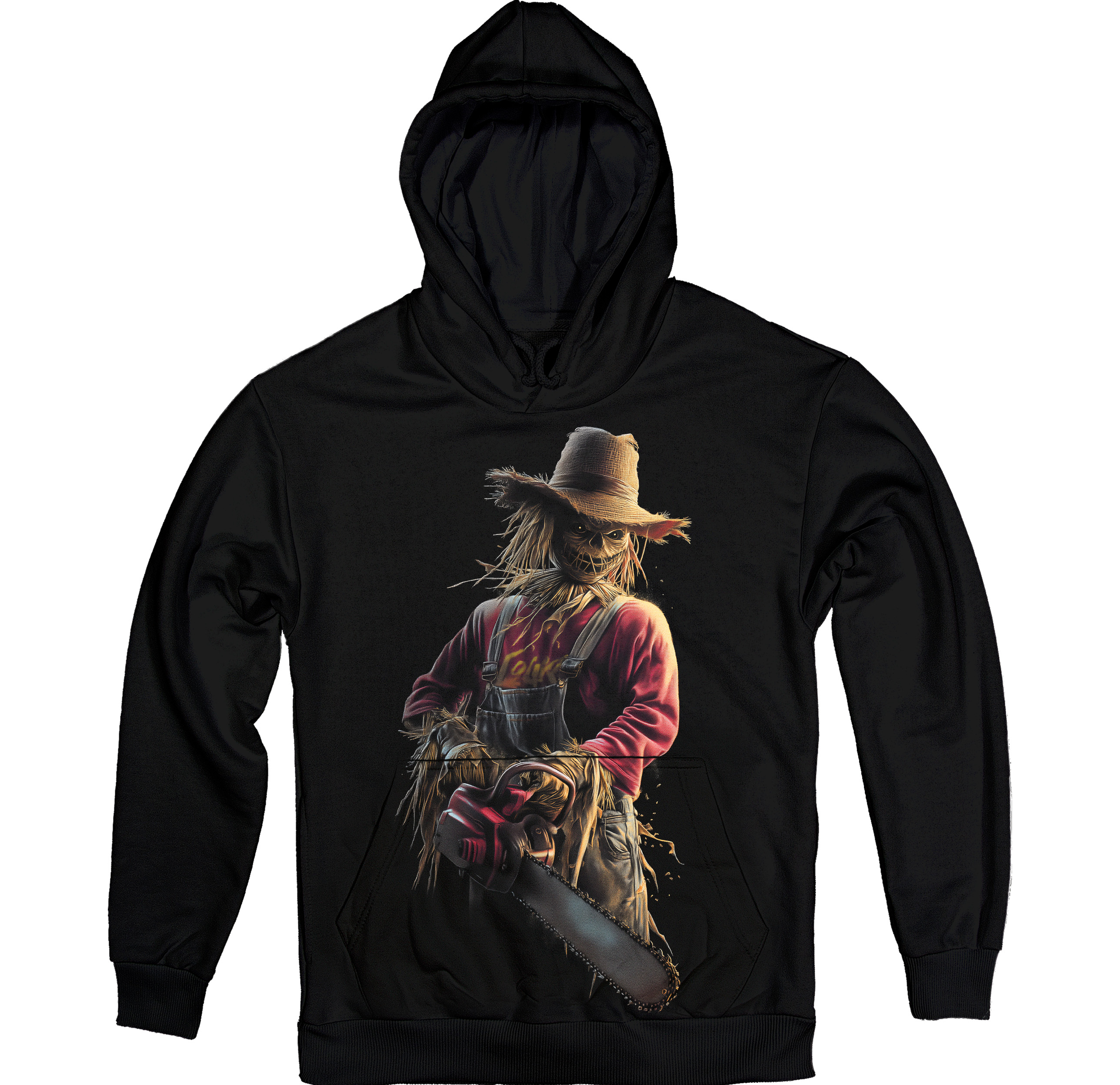 Стильне чорне худі з моторошним принтом — опудало у капелюсі та червоній сорочці, що тримає бензопилу. Деталізований дизайн передає атмосферу хоррор-фільму, додаючи образу дикої зловісності. Ідеально для фанатів страшних історій, вечірок на Хелловін та тих, хто хоче виділитися у натовпі.