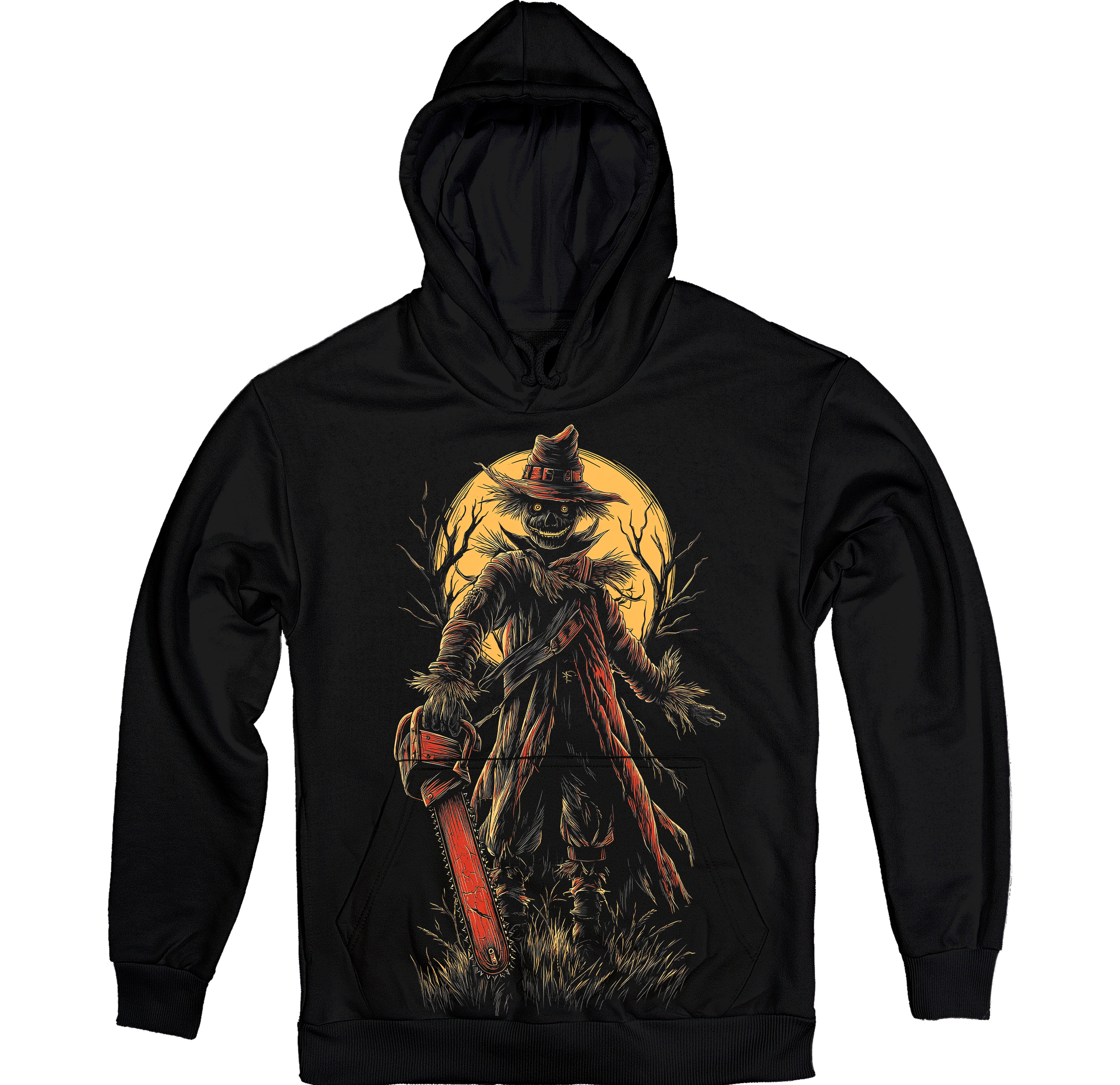 Чорне худі з атмосферним принтом — моторошне опудало з бензопилою на фоні повного місяця. Деталізований малюнок у темно-помаранчевих відтінках створює справжній хоррор-настрій. Ідеально підійде для фанатів готики, містики та Хелловіну, додаючи образу дикої сили й загадковості.
