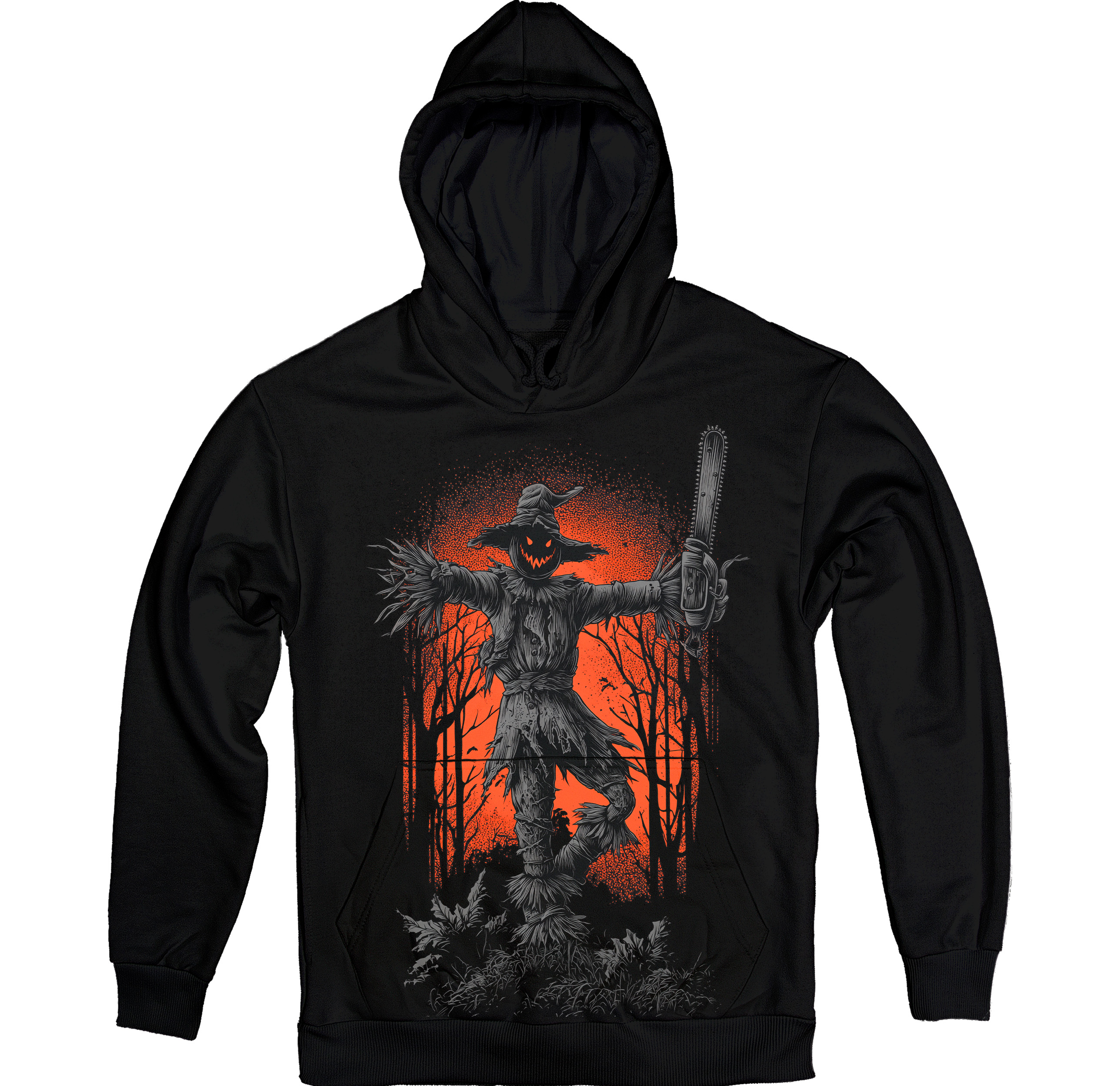 Чорне худі з моторошним принтом — опудало з гарбузовою головою, що тримає бензопилу на фоні палаючого червоного неба. Атмосфера жаху, тіней і темного лісу створює справжній хоррор-ефект. Ідеально для фанатів Хелловіну та темної естетики.