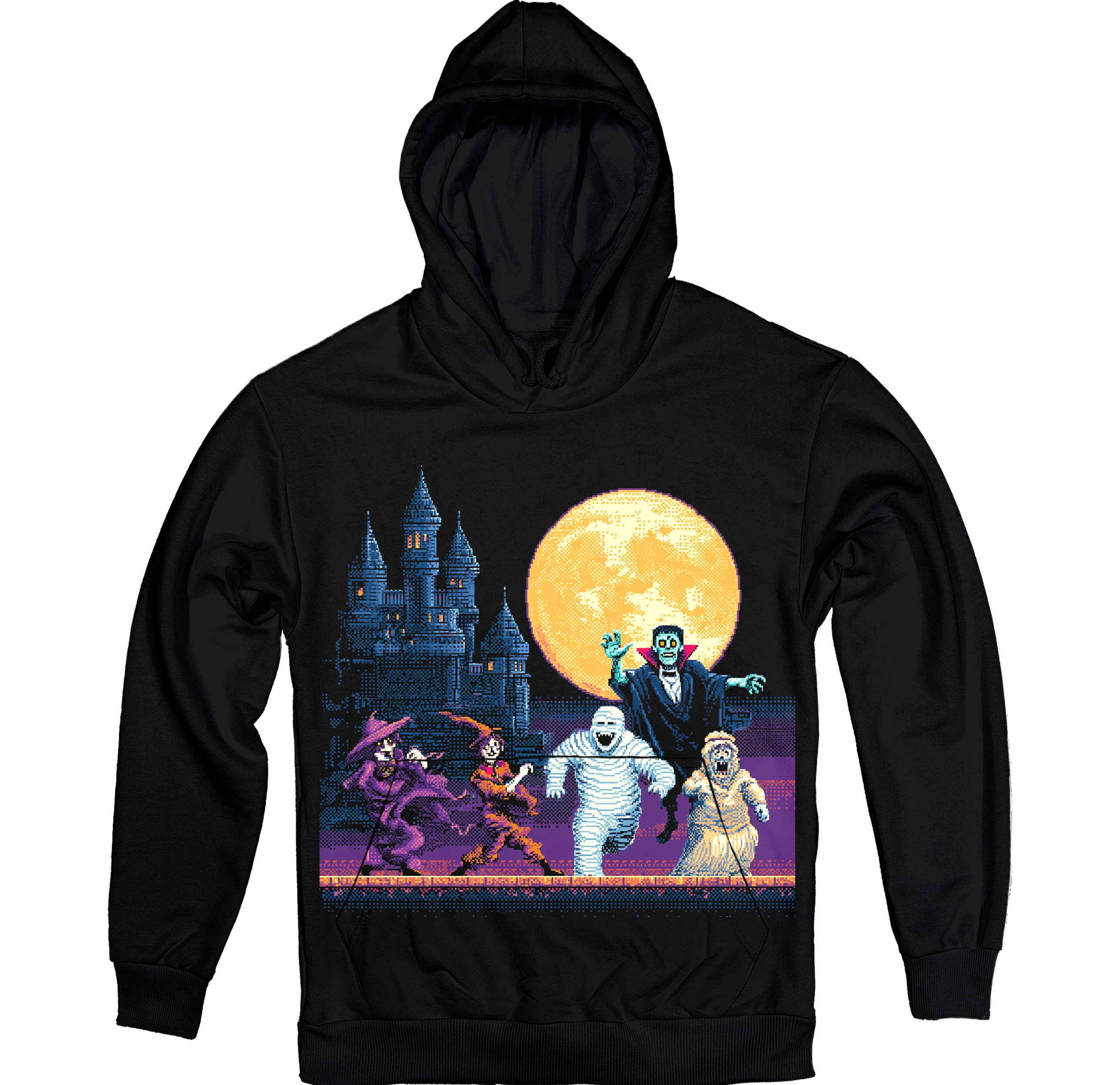 Чорне худі з яскравим 8-bit принтом, де відьми, мумія, привид та вампір вибігають із замку на тлі величезного місяця. Атмосфера ретро-ігор поєднана з хелловінським драйвом — стиль для тих, хто любить і ностальгію, і нічні жахи.