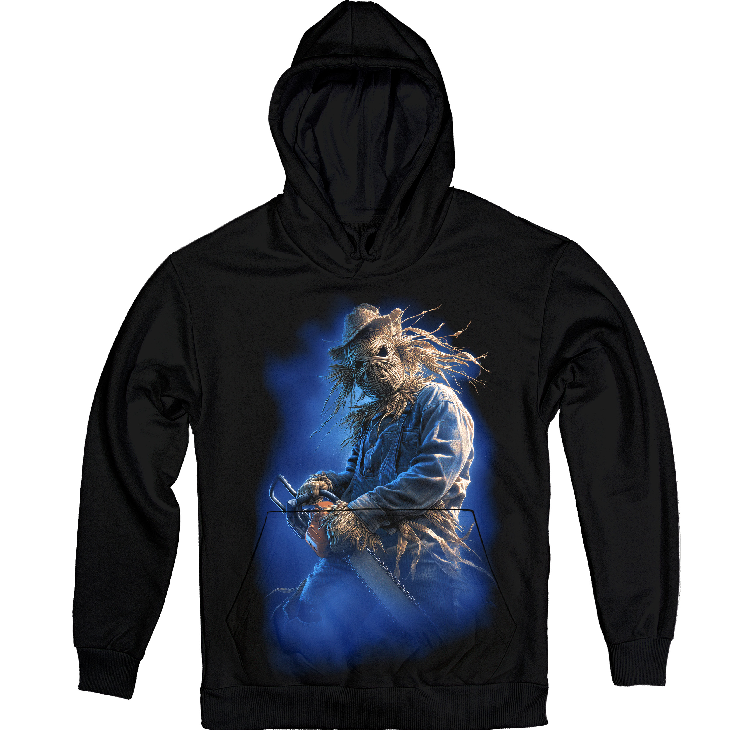 Чорне худі з моторошним принтом — опудало в джинсовому комбінезоні та капелюсі, що тримає бензопилу. Оточене синім примарним сяйвом, воно виглядає так, ніби вийшло прямо з нічного кошмару. Ідеальний вибір для фанатів хоррор-стилю та атмосферних образів на Хелловін.