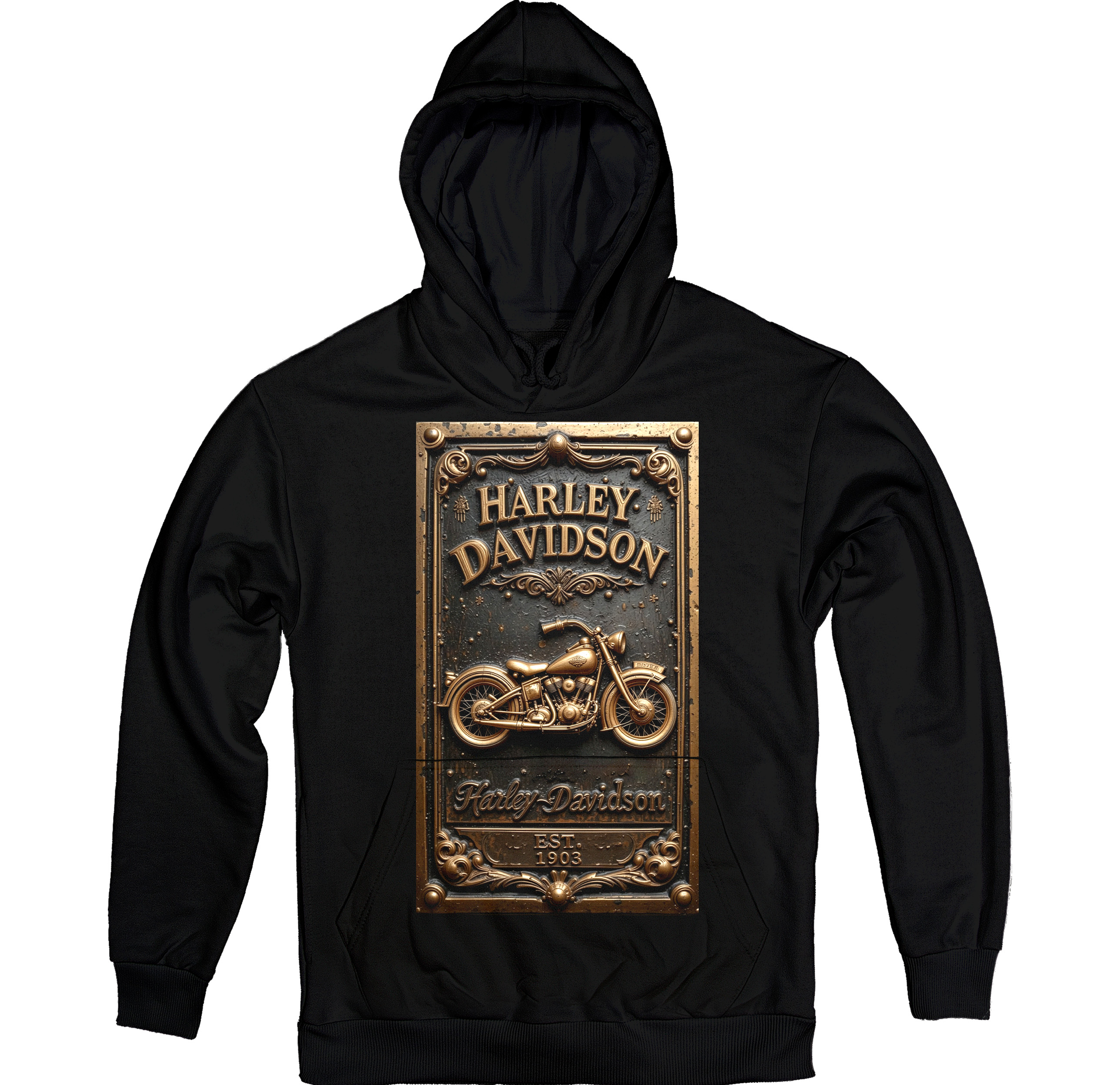 Чорне худі з ефектним 3D-принтом у стилі бронзової таблички Harley Davidson. Масивний дизайн із ретро-байком і написом Est. 1903 підкреслює дух легендарного бренду. Ідеально для справжніх фанатів байкерської культури та культових мотоциклів.