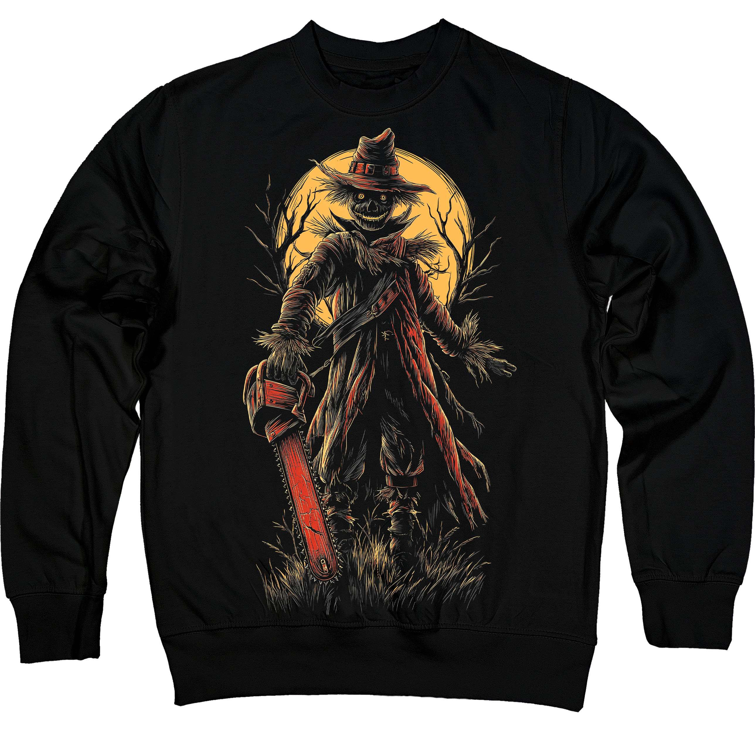 Світшот «Бензопильний Жах» – чорний з моторошним принтом опудала з бензопилою на фоні повного місяця. Ідеальний вибір для любителів хорор-стилю та Хелловіну.