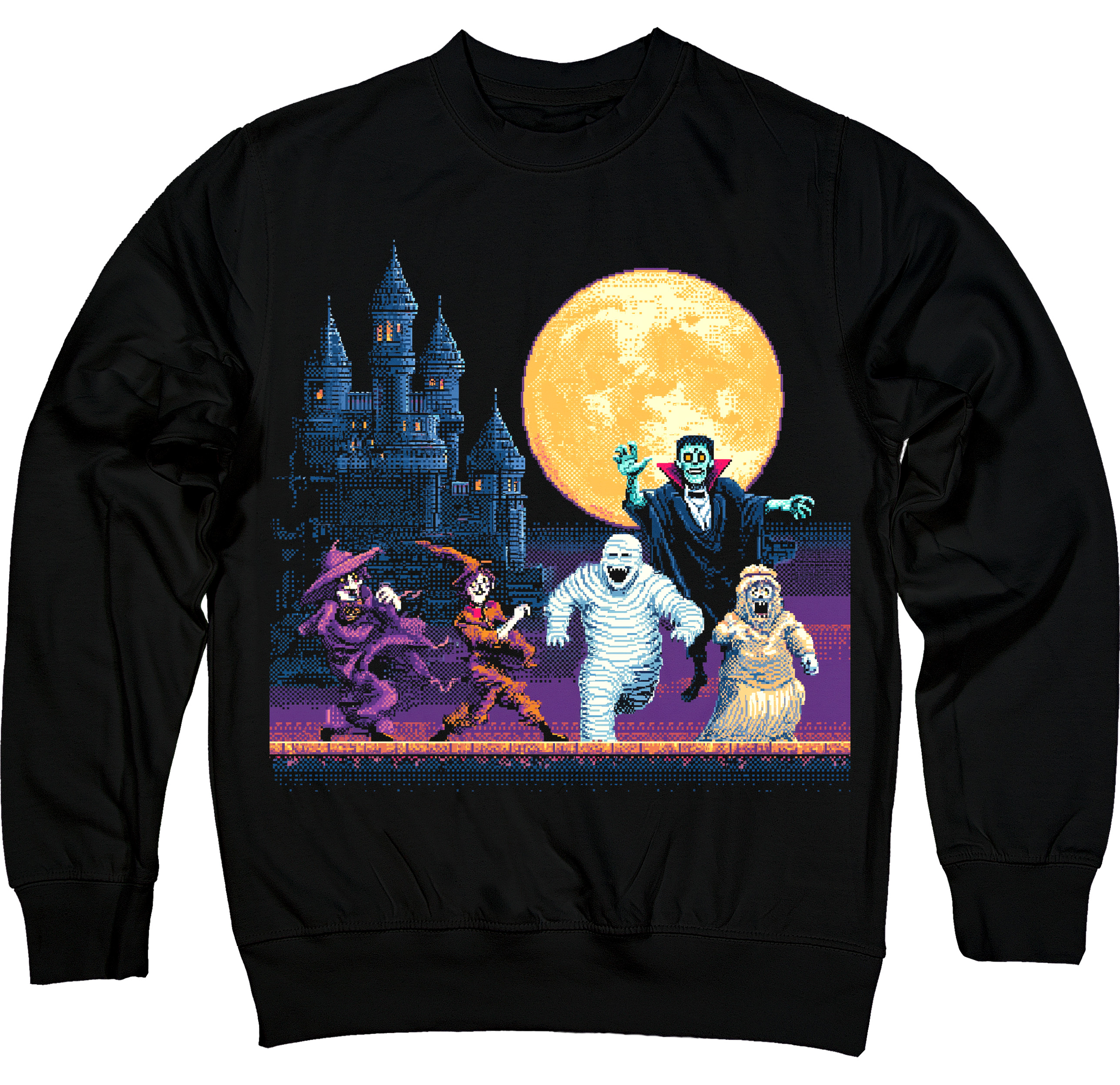 Світшот «Pixel Monsters Party» – чорний світшот із яскравим піксельним принтом: відьми, мумія, вампір та привид танцюють на фоні замку й повного місяця. Ідеальний варіант для любителів ретро-ігор та святкової атмосфери Геловіну.
