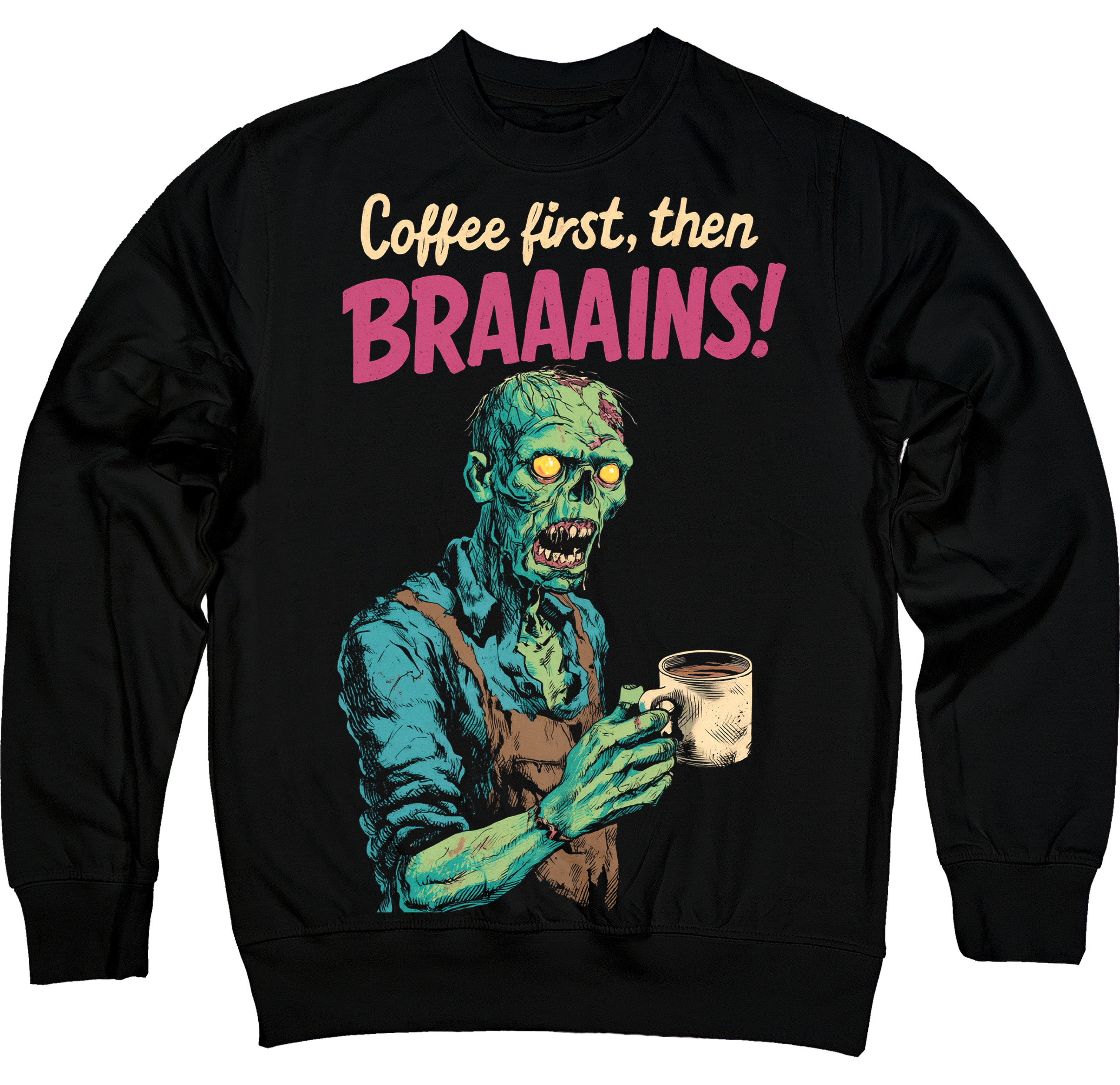 Коли кава — єдине, що тримає тебе серед живих! Цей чорний світшот із принтом «Coffee first, then BRAAINS!» поєднує чорний гумор, яскраву графіку та комфорт. Ідеальний для ранкових кавоманів, фанатів зомбі або тих, хто не хоче спілкуватися до першої чашки. М’яка тканина, насичений друк, стиль, що «оживить» будь-який день!