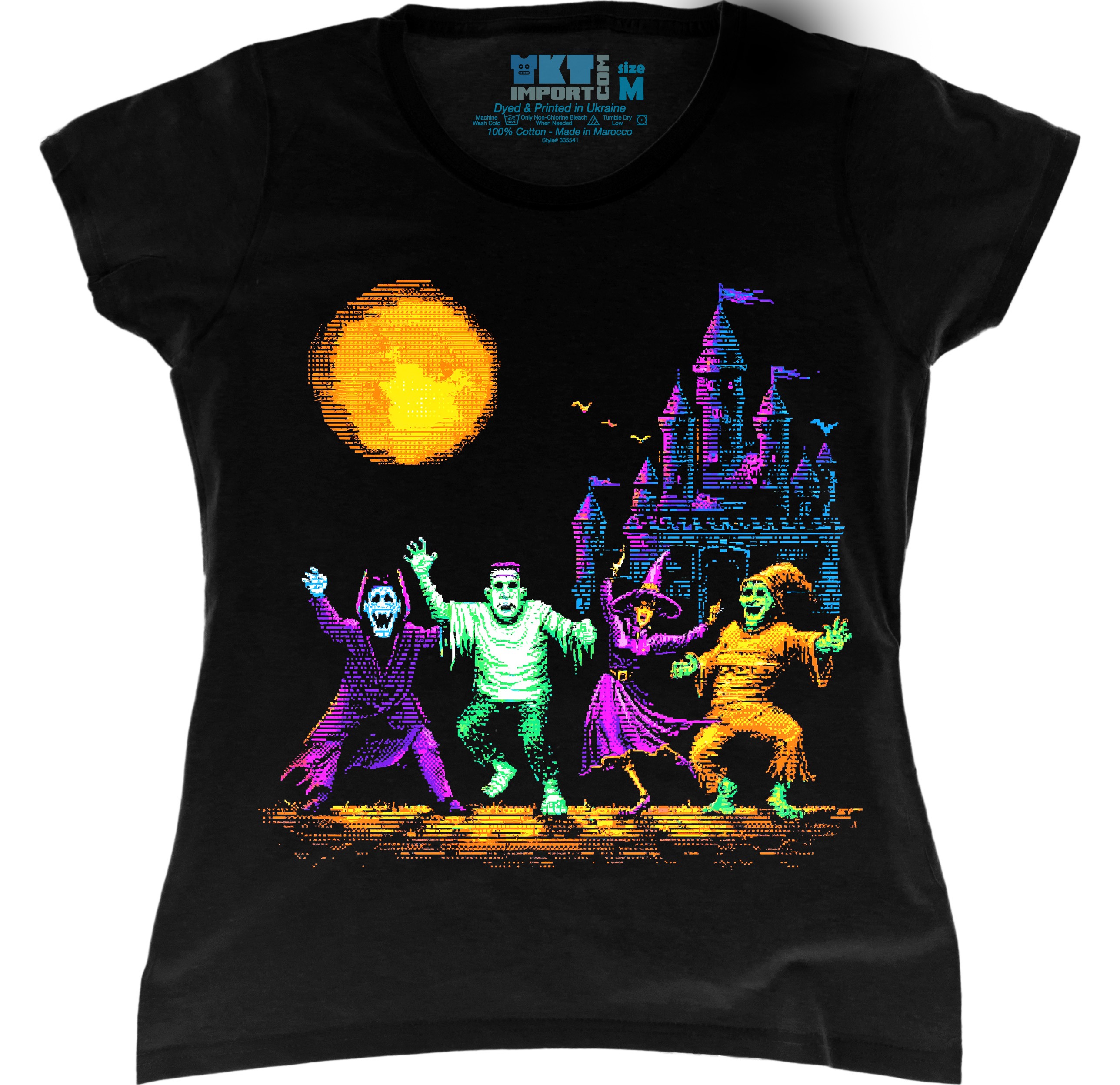 Світиться місяць, замок на горизонті, а монстри вже на танцполі! Ця жіноча футболка “Monster Dance Party” — вибух неонових фарб і хелловінського настрою. Яскравий принт у ретро-стилі: Дракула, Франкенштейн, відьма і привид танцюють під нічним небом. М’яка бавовна, комфортний крій і насичений колір — ідеальний варіант для фанаток креативних принтів і нічних вечірок!