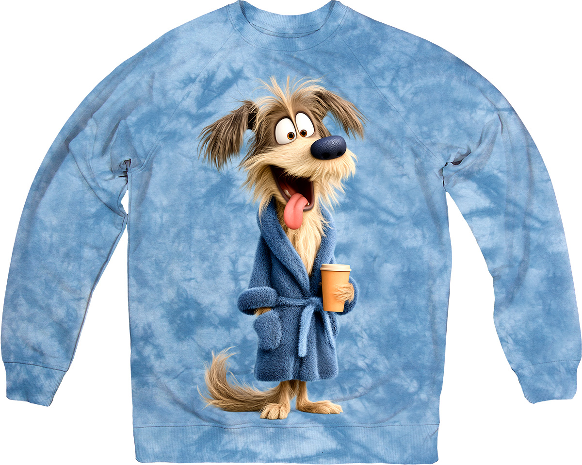 Цей пес точно знає секрет ідеального ранку — халат, кава і гарний настрій! Світшот “Morning Dog” — це поєднання комфорту та гумору. М’який матеріал, приємний блакитний колір і принт із веселим песиком у халаті створюють настрій навіть у похмурий день. Ідеальний вибір для кавоманів, любителів тварин і тих, хто цінує затишок у стилі.