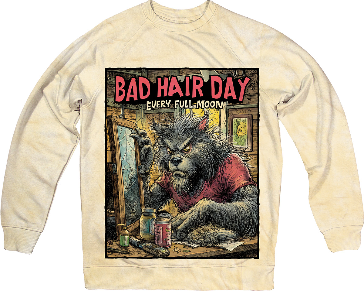 Коли навіть вовкулака має “поганий день для волосся”. Світшот “Bad Hair Day” створений у стилі старих хорор-коміксів. На яскравому принті — перевертень перед дзеркалом, який бореться з наслідками повного місяця. М’який бежевий колір, приємна тканина та оригінальний ретро-дизайн роблять цей світшот ідеальним для любителів гумору, Хелловіну та вінтажної естетики.