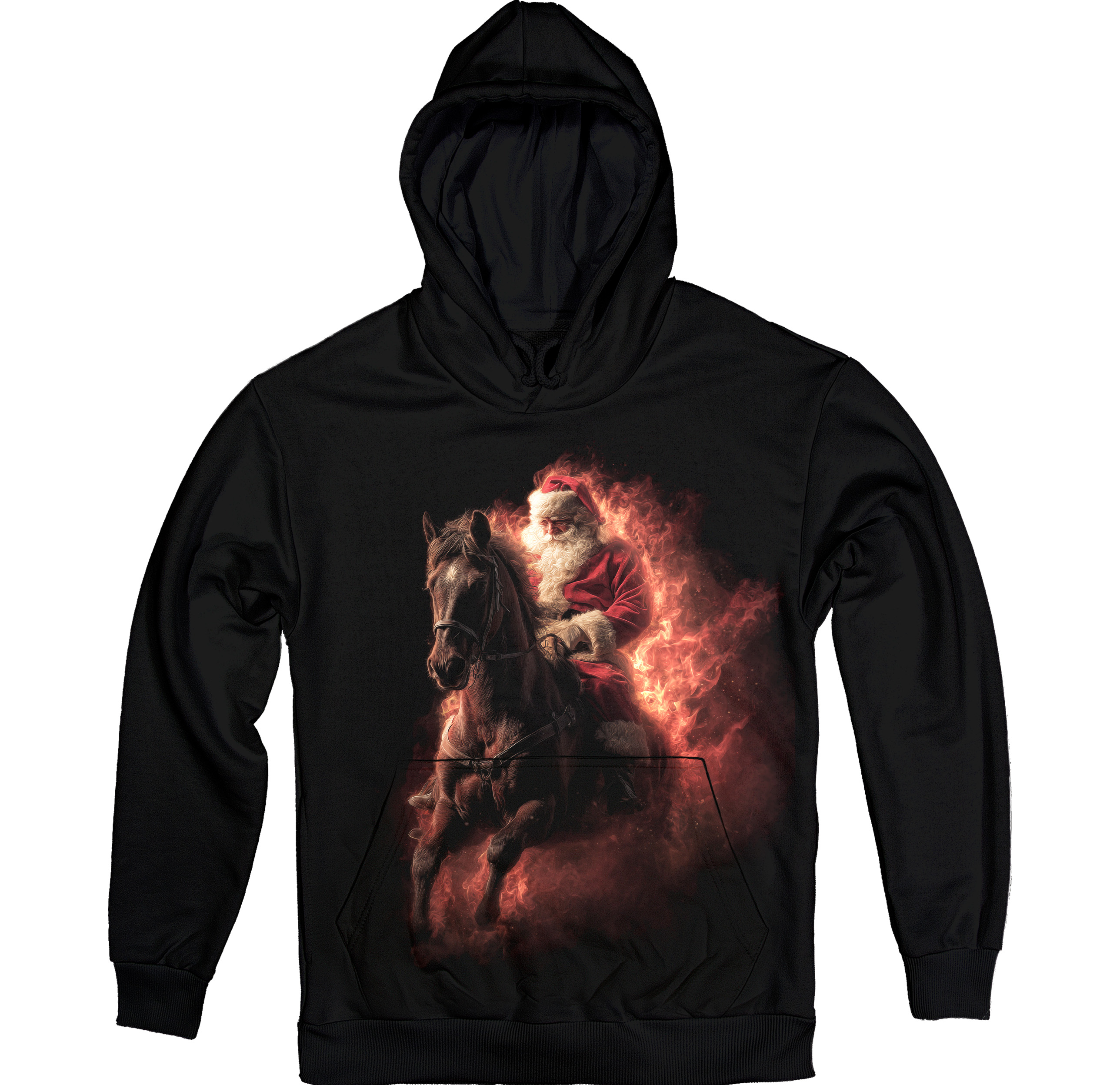 Стильне худі з потужним образом Санти на полум’яному коні. Для тих, хто поєднує святковий дух із вогнем енергії та драйву.