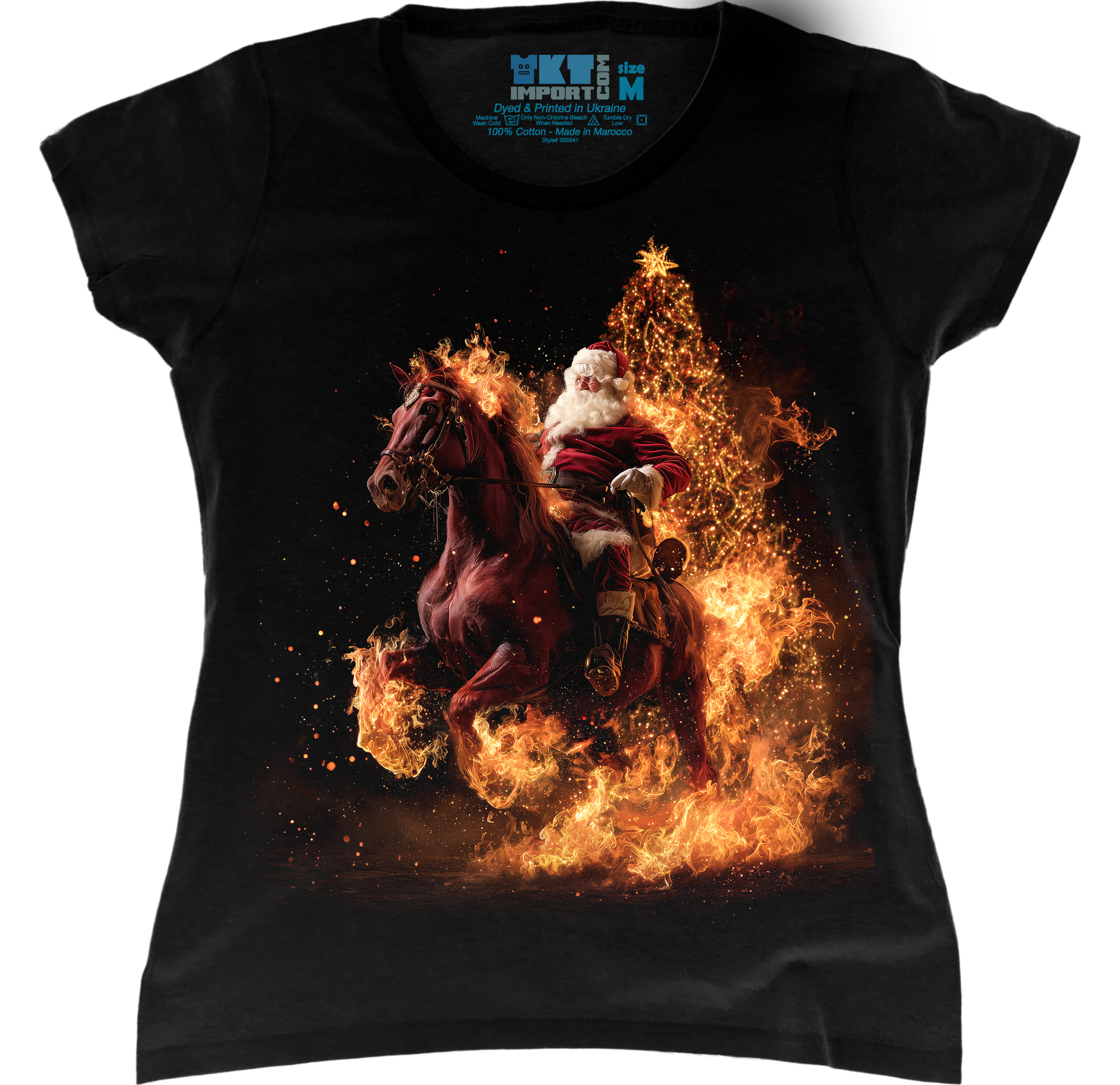 Жіноча футболка з образом Санти на вогняному коні біля сяючої ялинки. Символ тепла, сили й справжнього святкового настрою.
