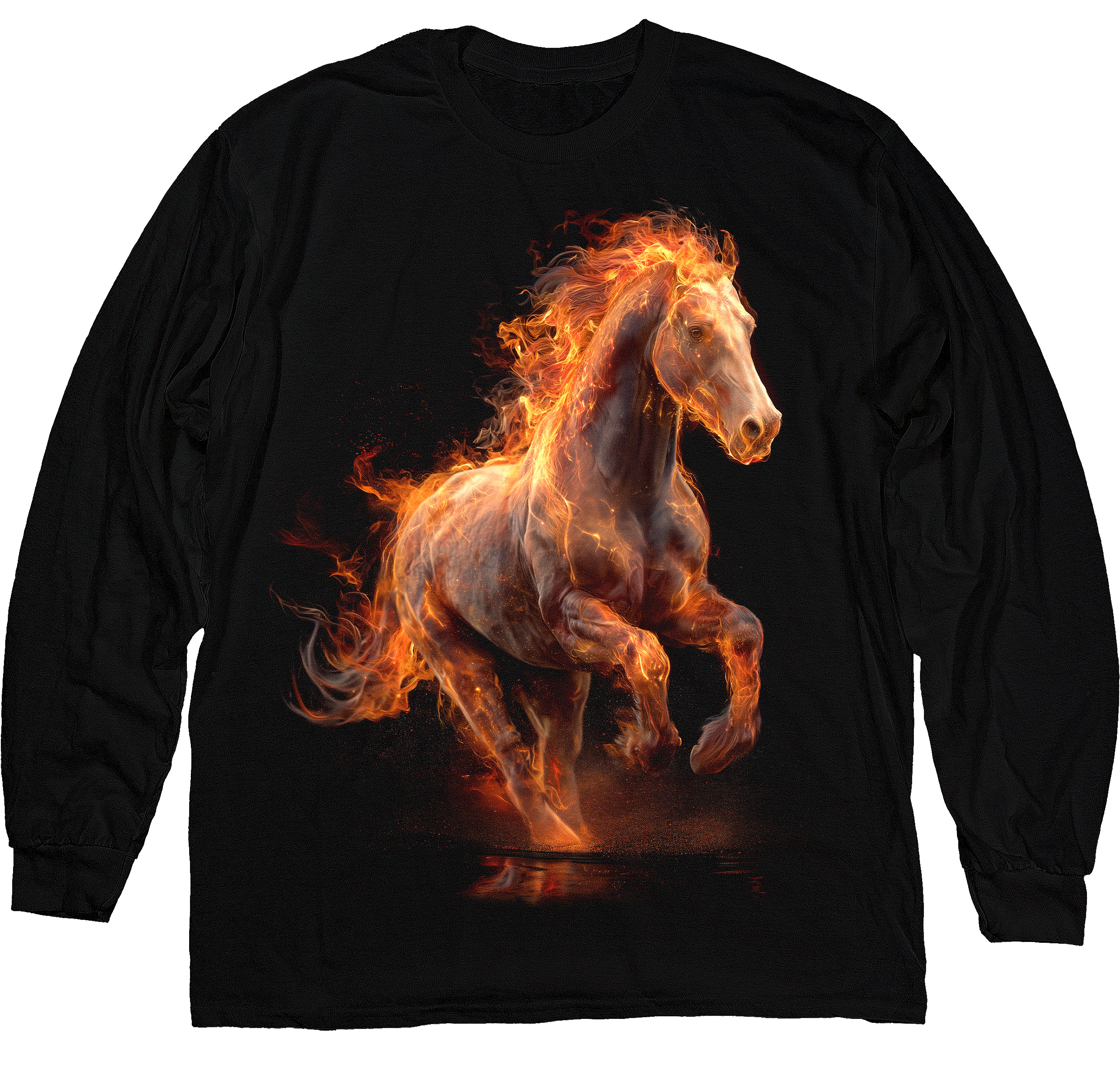 Лонгслів із приголомшливим принтом коня у полум’ї — символом енергії, швидкості та свободи. Для тих, хто живе на повну.
