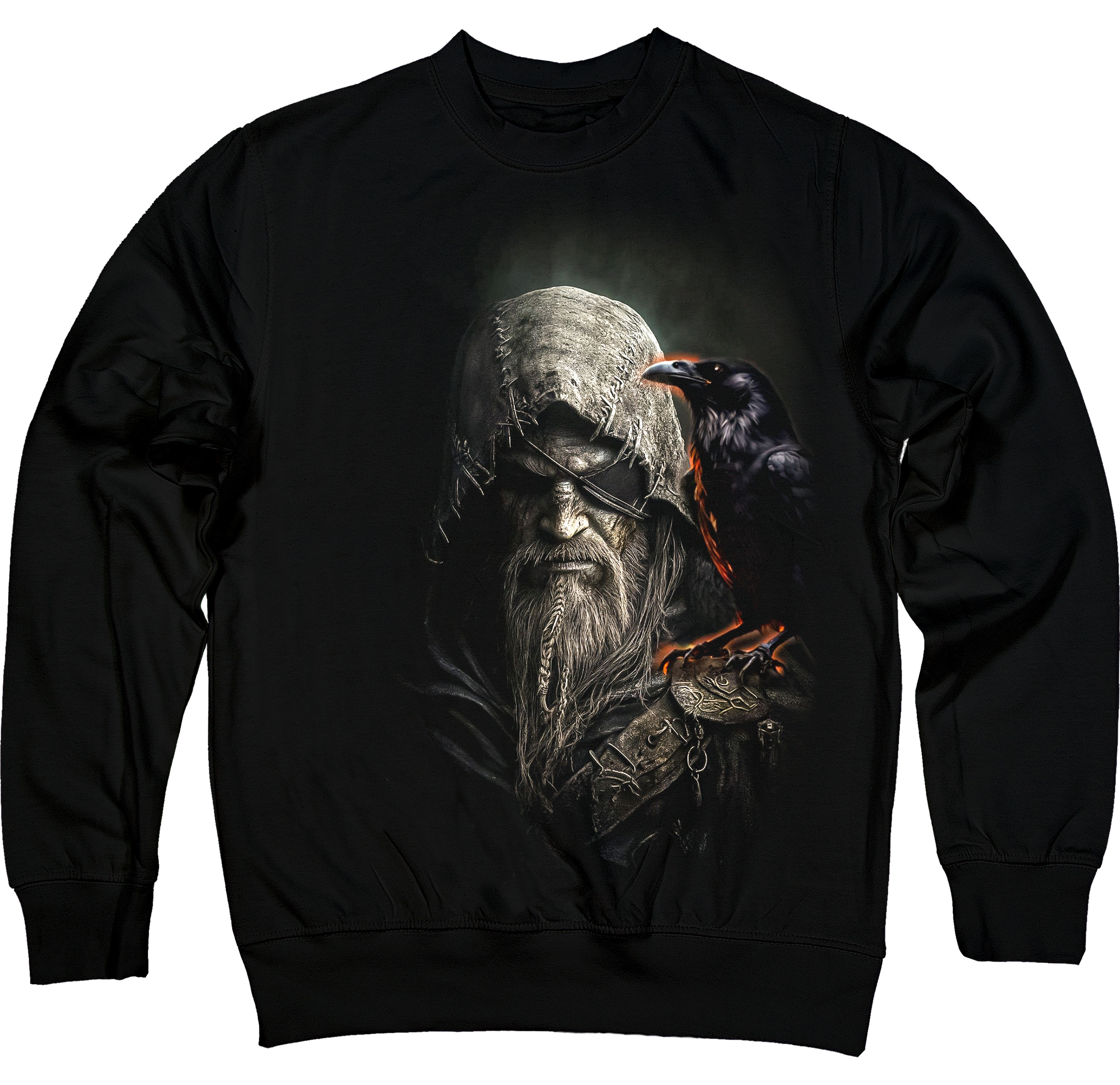 Світшот із вражаючим принтом Одіна та ворона — символів мудрості, сили й скандинавського духу. Ідеальний вибір для поціновувачів міфології та темної естетики.