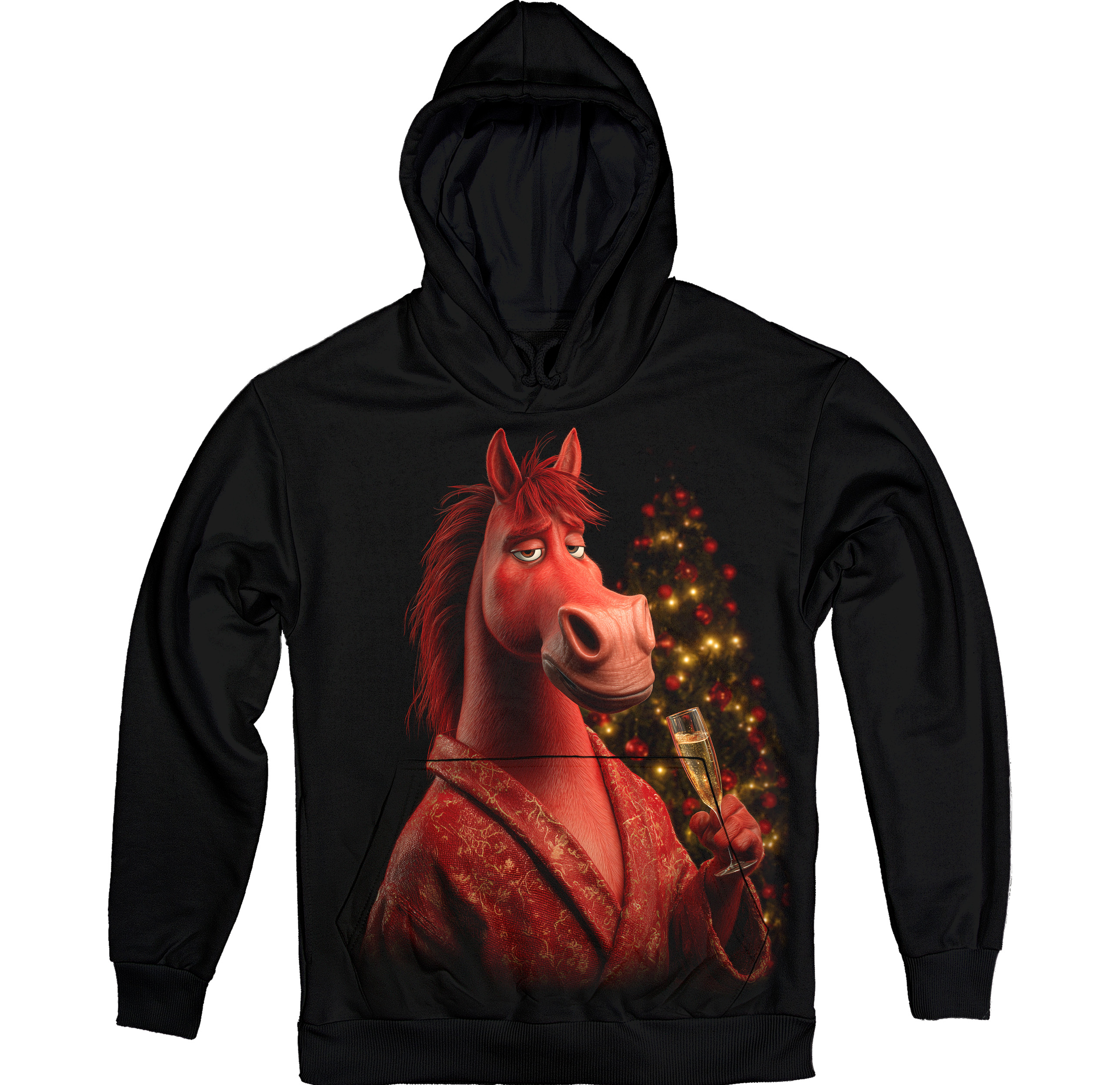 Худі з кумедним конем у халаті та з келихом шампанського — для тих, хто святкує з іронією. Ідеальний образ для релаксу біля ялинки або вечірки з друзями.