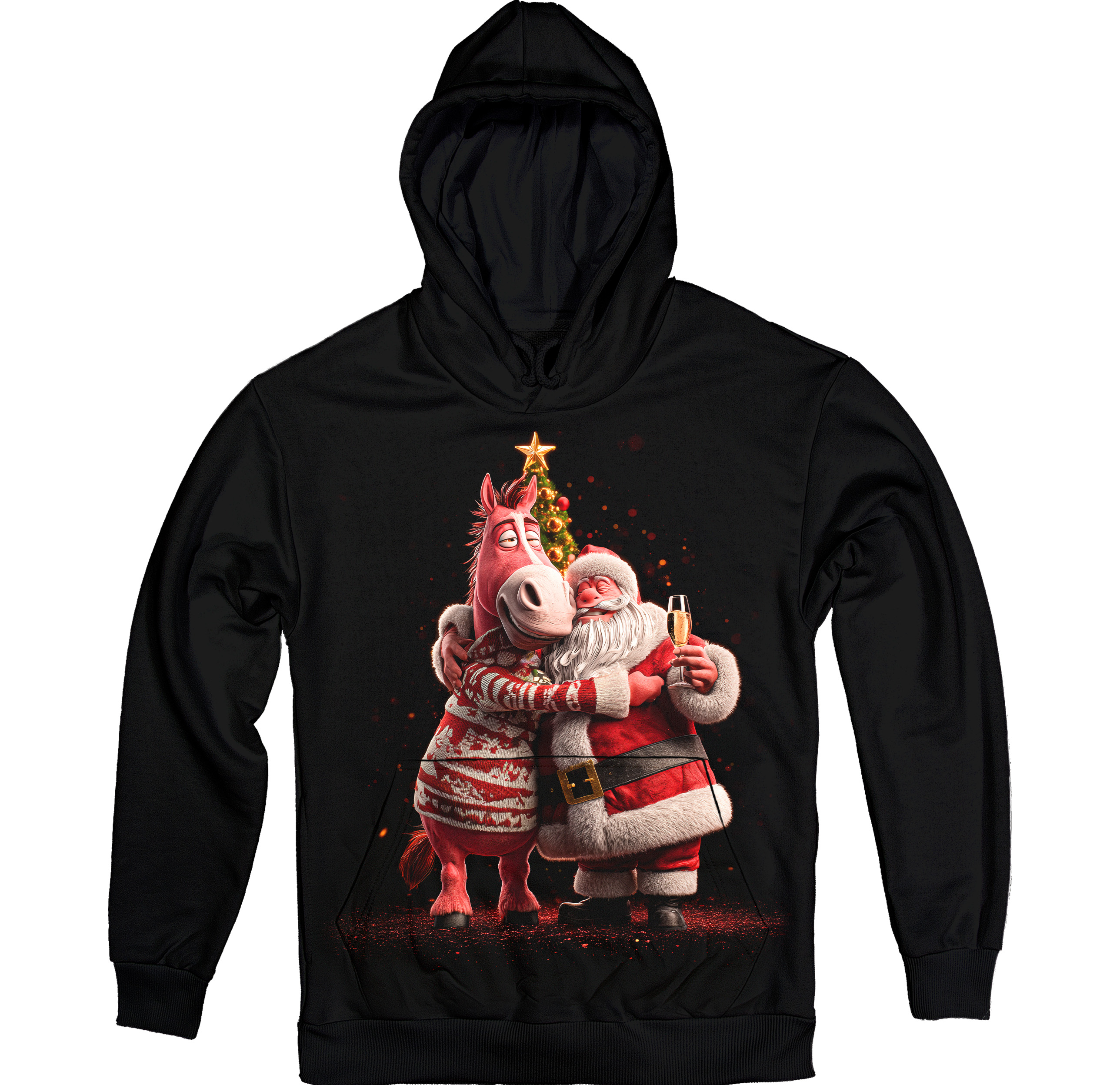 Тепле новорічне худі з веселим принтом Санти та коня біля ялинки. Ідеальний вибір для свят і зимових вечорів. М’яка тканина, комфортна посадка, яскравий принт DTG.