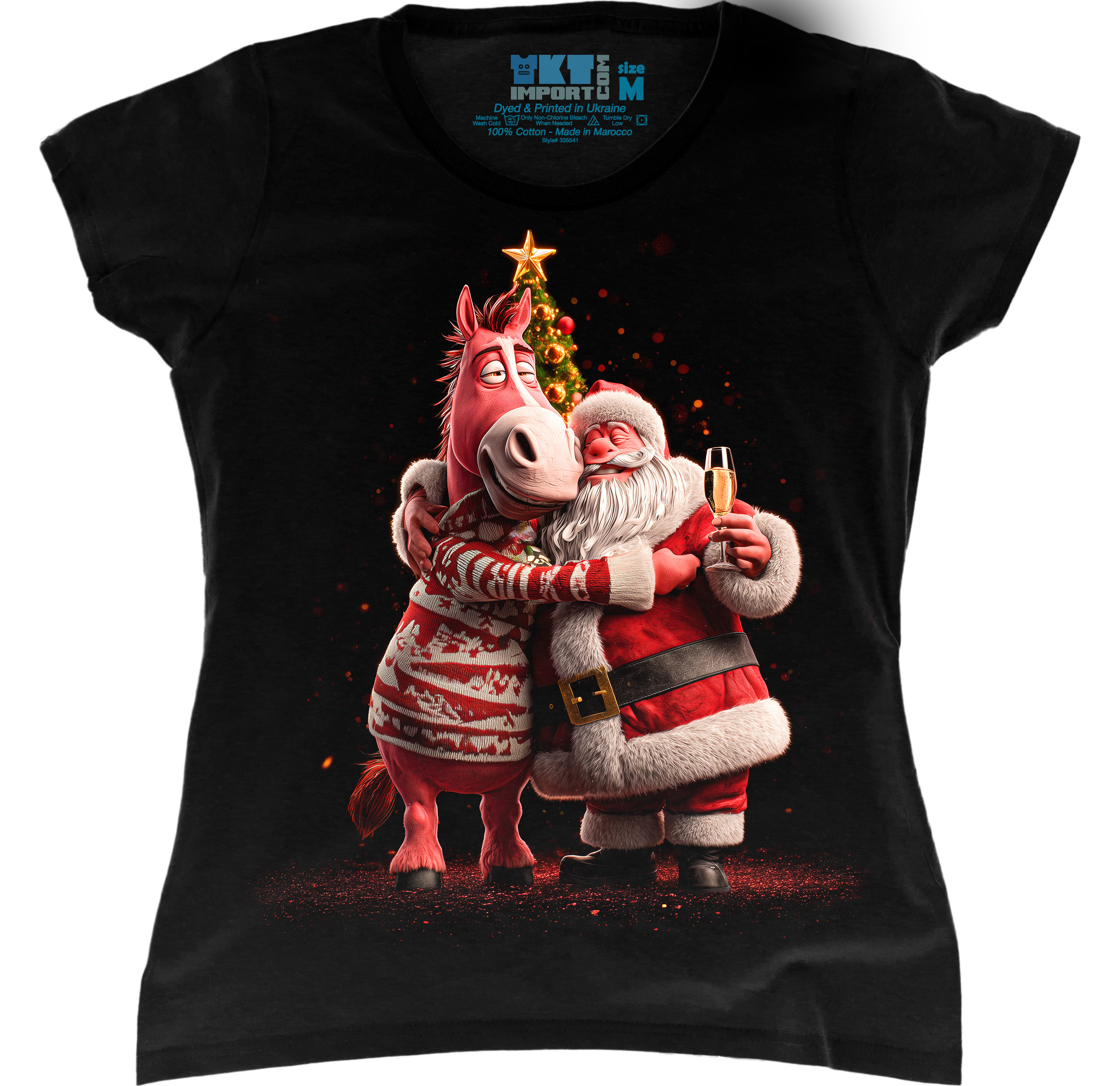 М’яка жіноча футболка з новорічним принтом Санти та коня біля ялинки. Ідеальна для створення святкового настрою, домашніх посиденьок чи подарунку близьким. Якісний кольоровий друк DTG, приємна на дотик тканина, стильний крій.