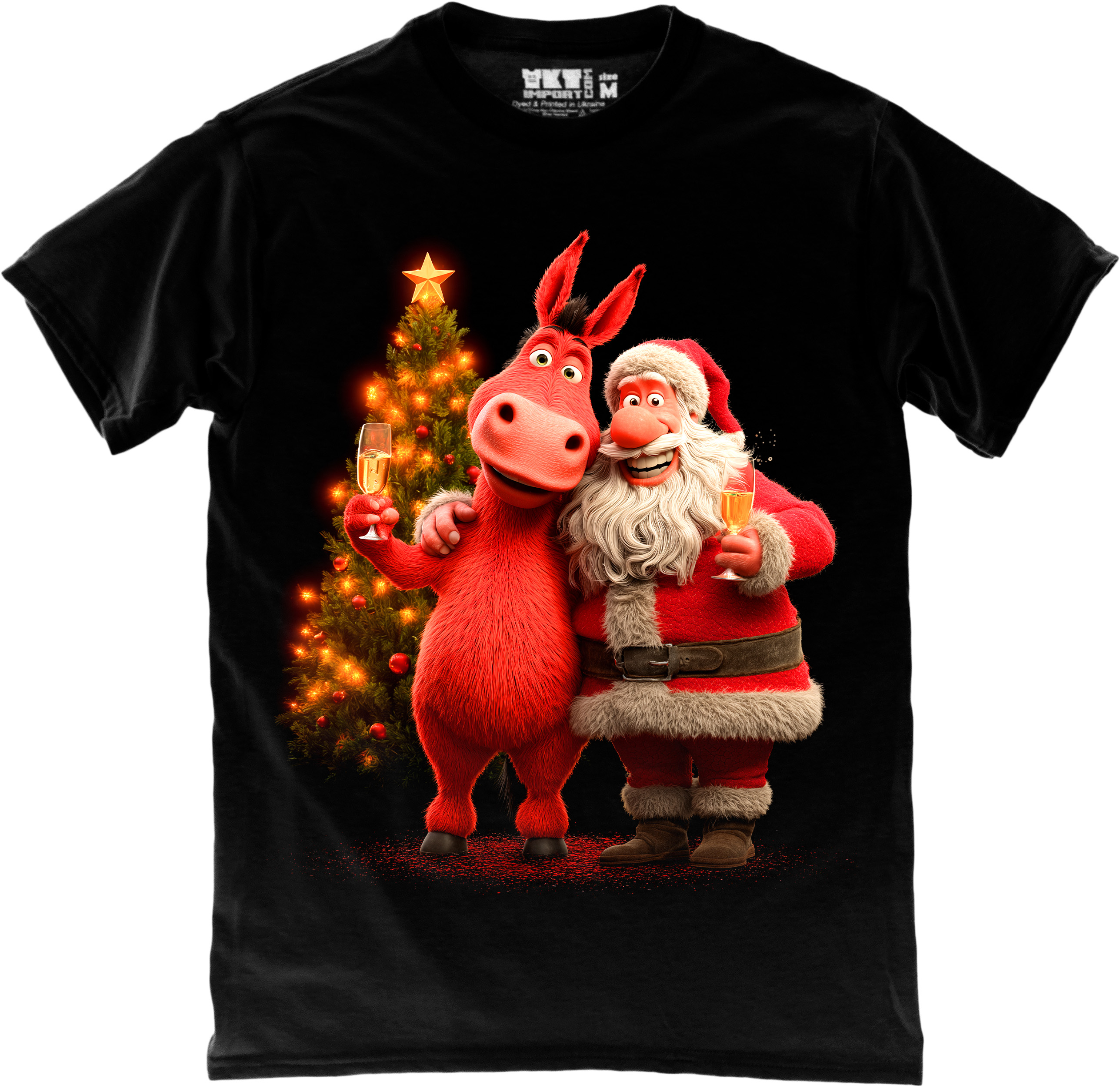 Кумедна новорічна футболка з принтом Санти та коня біля ялинки з келихами шампанського. Дарує святковий настрій і посмішку з першого погляду. Якісний яскравий друк DTG, 100% бавовна, приємна до тіла тканина — чудовий вибір для подарунку або різдвяної вечірки.
