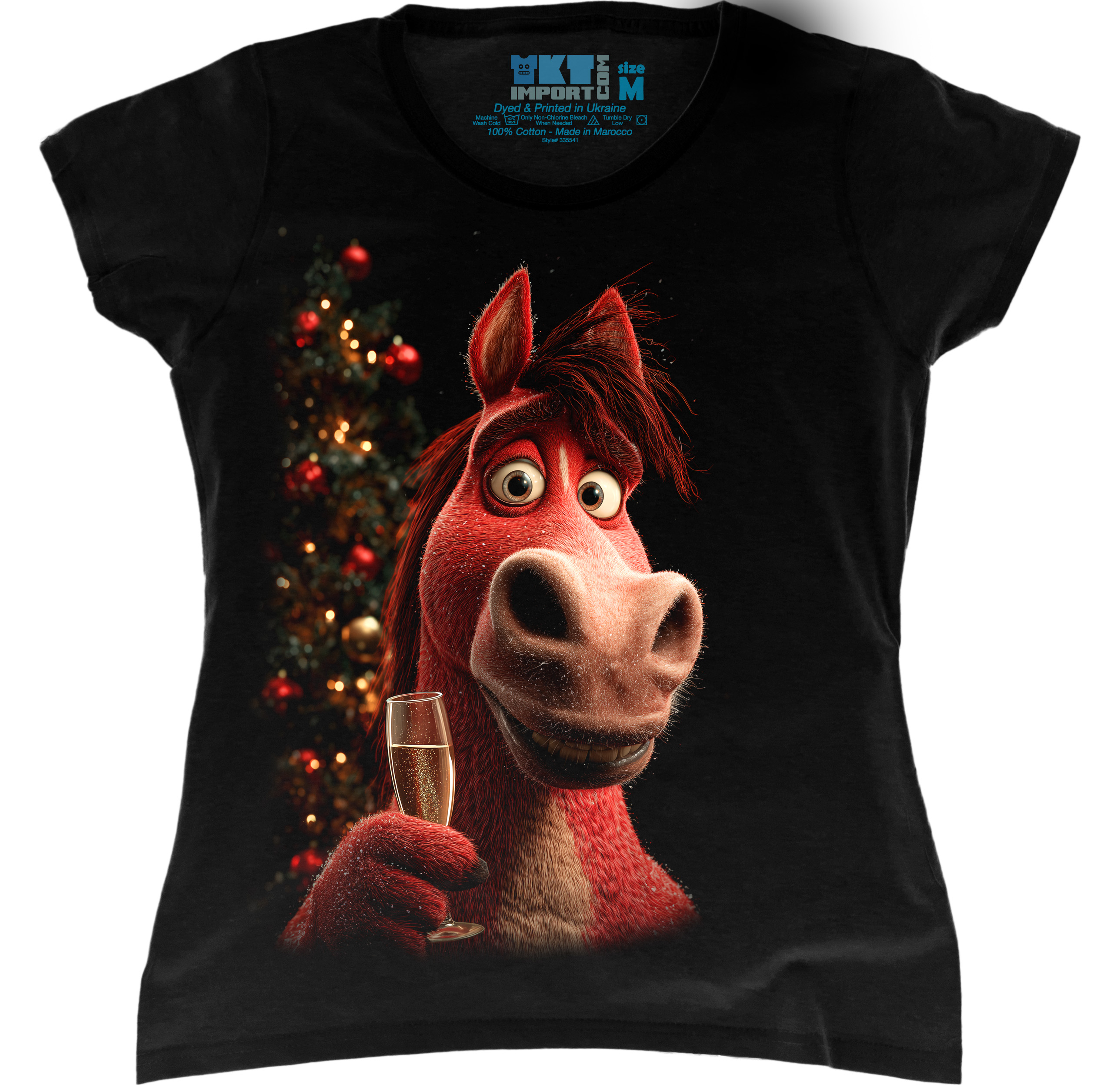 Коли Новий рік — це не просто свято, а стиль життя. Наш Кінь із келихом шампанського готовий підняти тост за гарний настрій і чудові свята! Ця футболка створена для дівчат, які люблять гумор, блиск і знають, як святкувати красиво.