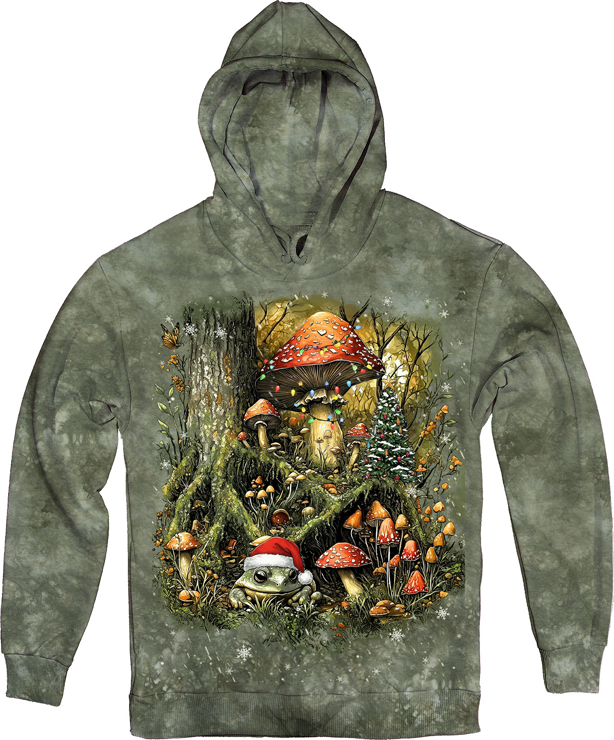 Затишне худі з казковою лісовою галявиною, яскравими грибами та милим жабеням у шапці Санти. Святковий дизайн, що створює новорічний настрій і виділяє з натовпу.