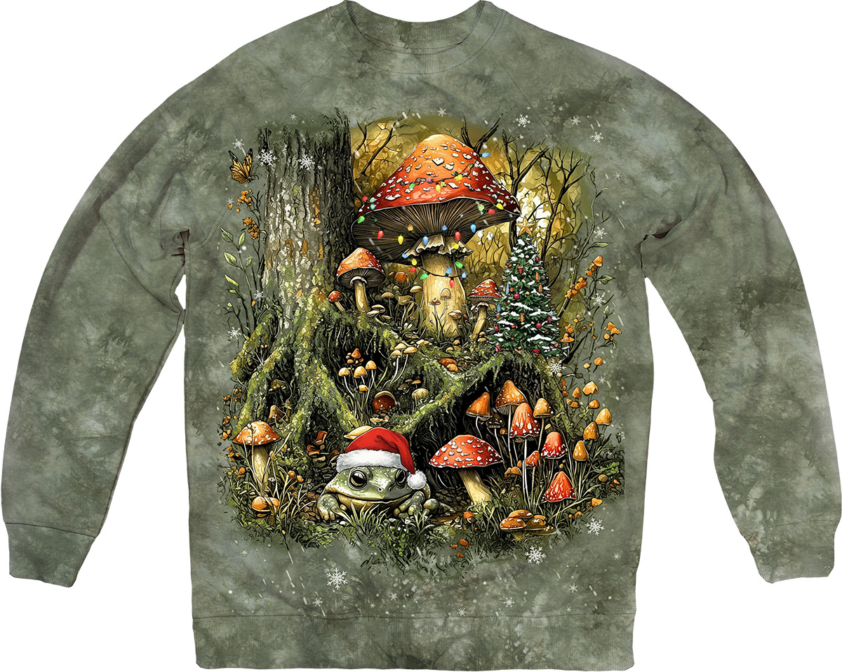 Святковий світшот із магічною лісовою галявиною, яскравими грибами та кумедною жабкою в шапці Санти. Теплий, затишний і ідеальний для новорічного настрою.