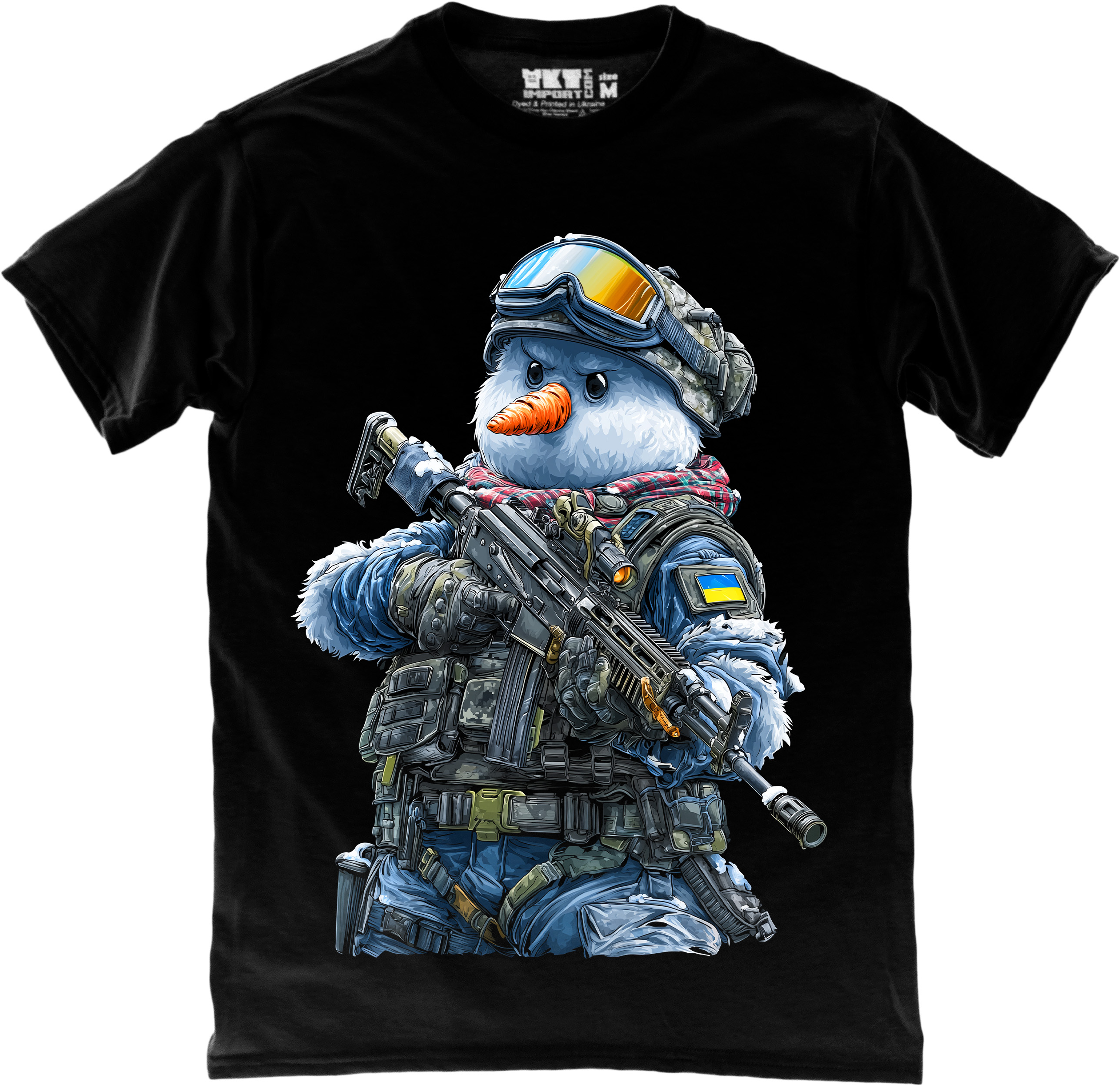 Яскравий та стильний дизайн зі сніговиком-захисником у військовому екіпіруванні. Патріотичний принт з українським прапором — сміливий образ для тих, хто підтримує незламність та дух України.
