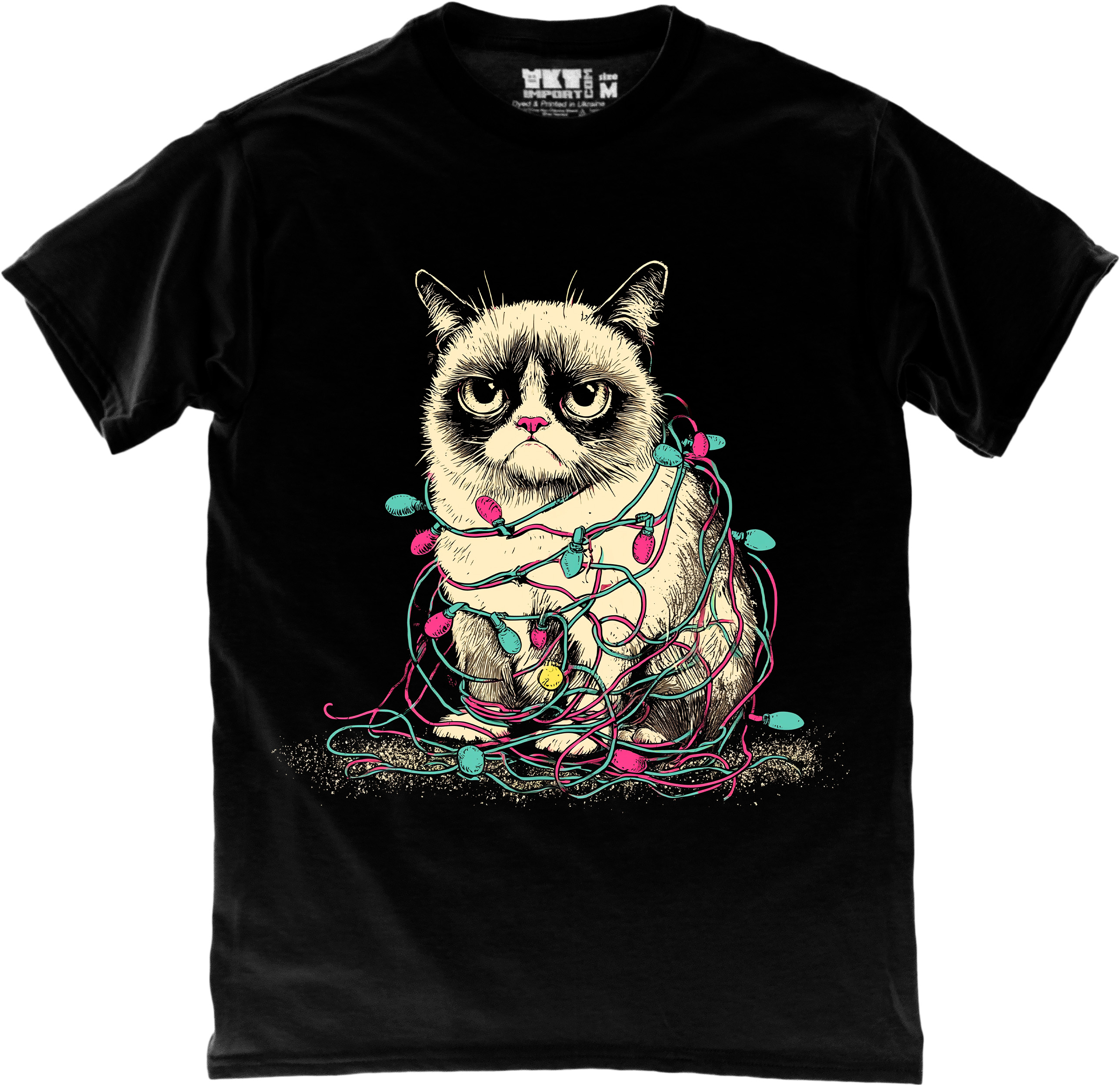 Кіт, який ненавидить свята, але знову опинився в гірляндах. Ідеальний принт для тих, хто святкує з виразом “ну ок”.