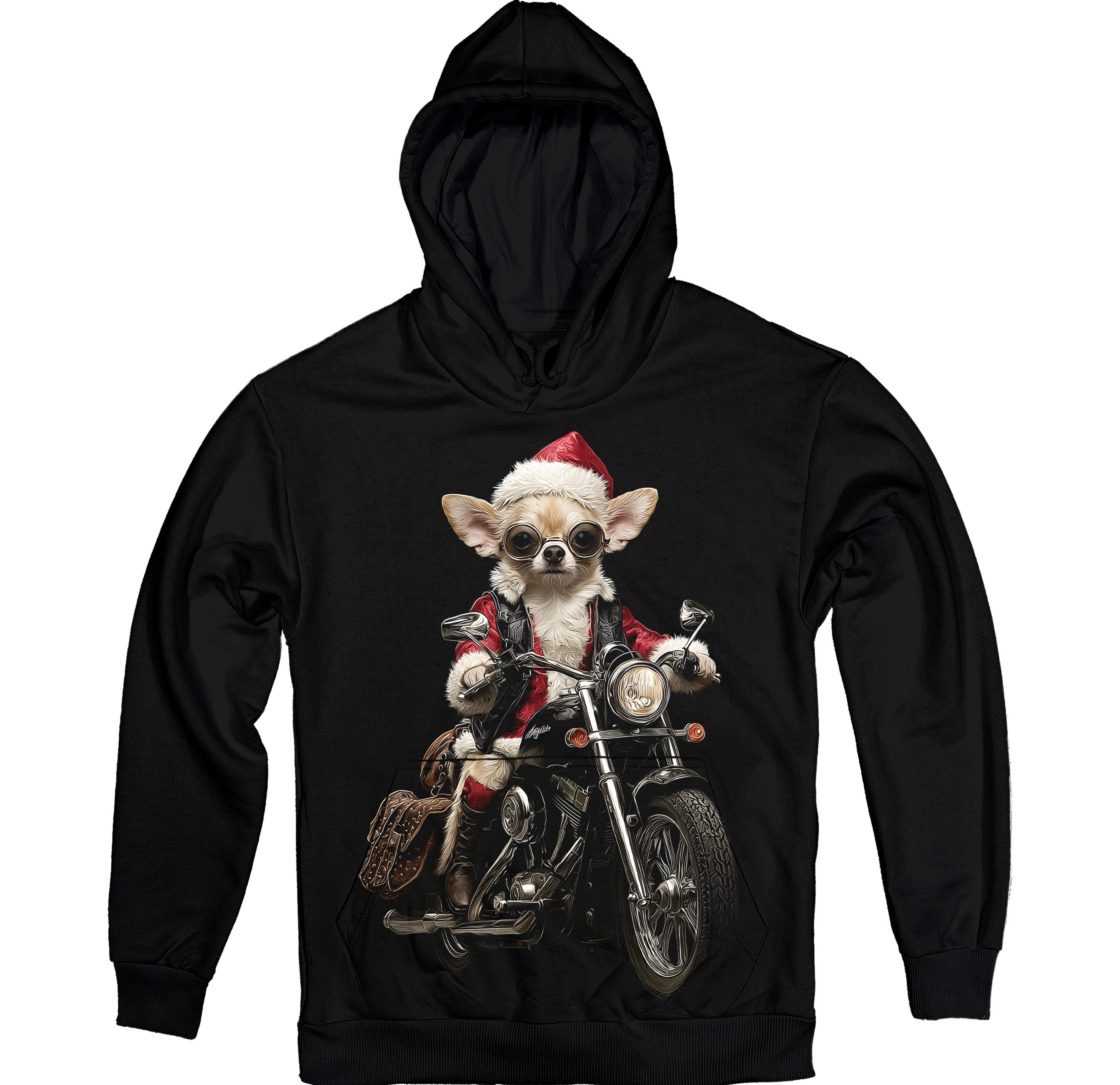 Крута чихуахуа-байкер у костюмі Санти — веселий святковий дизайн, що поєднує милість і справжній байкерський дух. Яскравий принт, стильні окуляри та мотоцикл створюють ідеальний новорічний образ для тих, хто любить гумор і оригінальні речі.