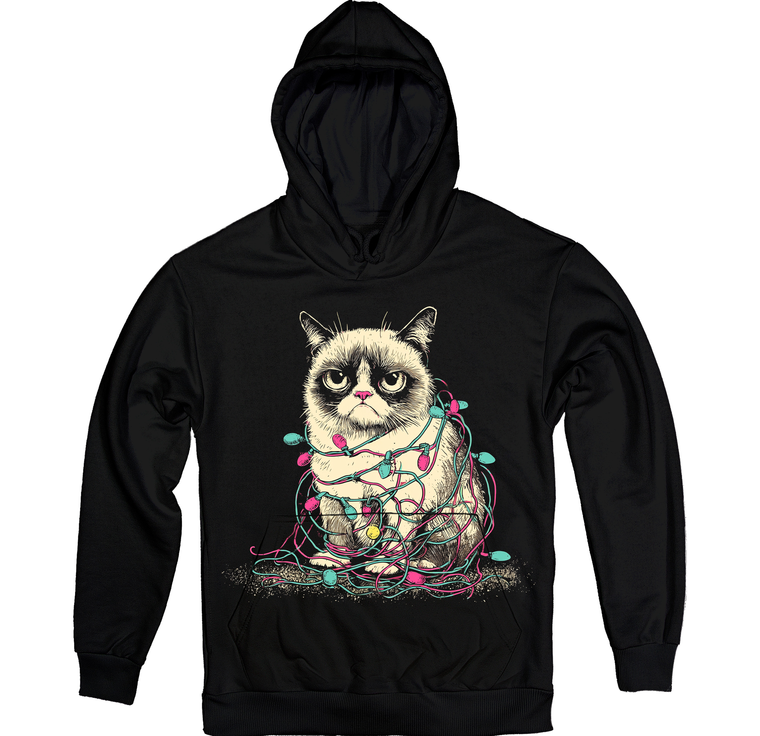 Грумпі Кіт у святкових гірляндах — максимально невдоволений і максимально стильний. Ідеальне худі для тих, хто любить Різдво, але без зайвих емоцій. Яскравий принт і фірмовий гумор, що точно приверне увагу.