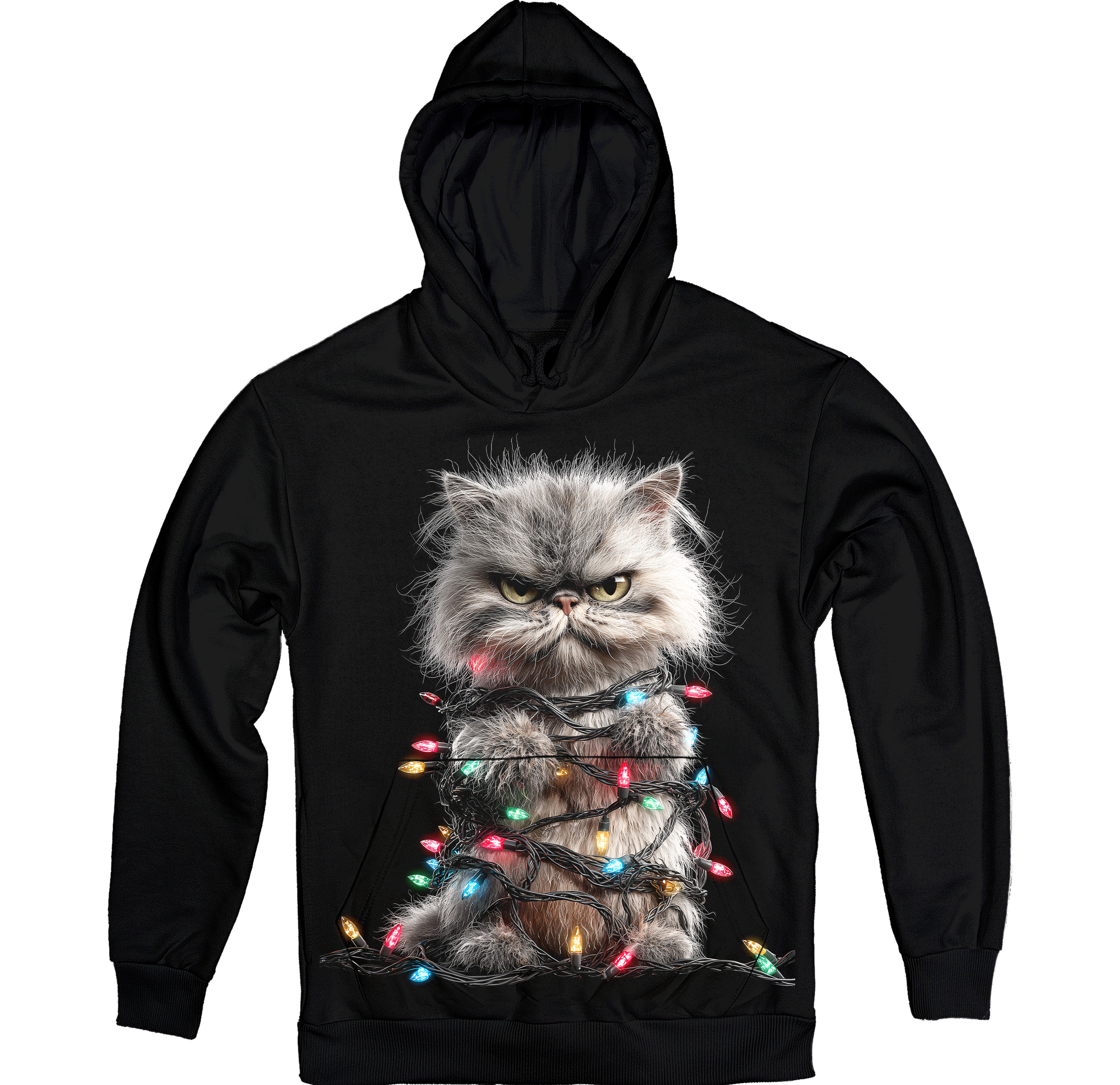 Худі з сердитим пухнастим котом, заплутаним у яскравих гірляндах — ідеальний жартівливий образ для зимових свят. Максимальна милість і мінімум настрою в одному принті!