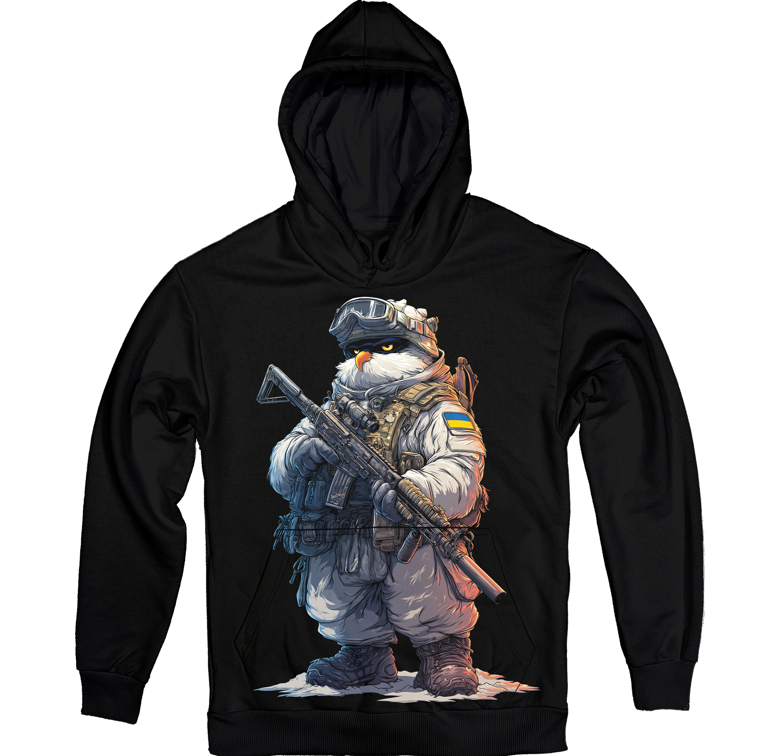 Бойовий пінгвін у повній зимовій амуніції стоїть як справжній герой — холодний, врівноважений і максимально тактичний. Потужний вигляд, камуфляж, зброя та український прапор на плечі створюють стильний і жартівливий образ зимового захисника. Такий худі одразу привертає увагу та заряджає бойовим настроєм.