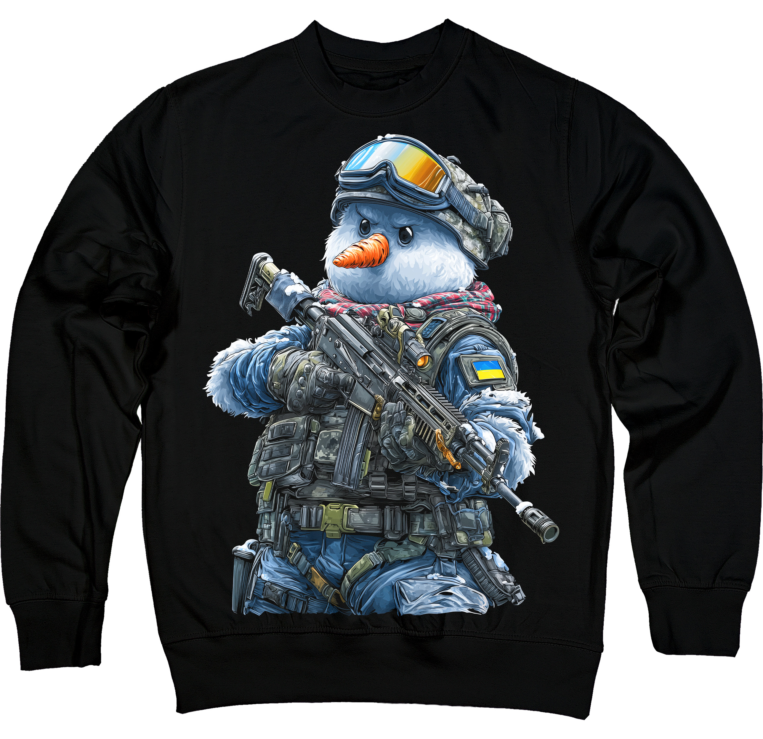 Брутальний тактичний сніговик, екіпірований як справжній боєць: окуляри, шолом, броня та зброя — усе на місці. Холодний погляд, маскувальний одяг і український прапор на рукаві роблять його символом незламності та зимового драйву. Ідеальний принт для тих, хто цінує стиль, силу та трошки зимового гумору.