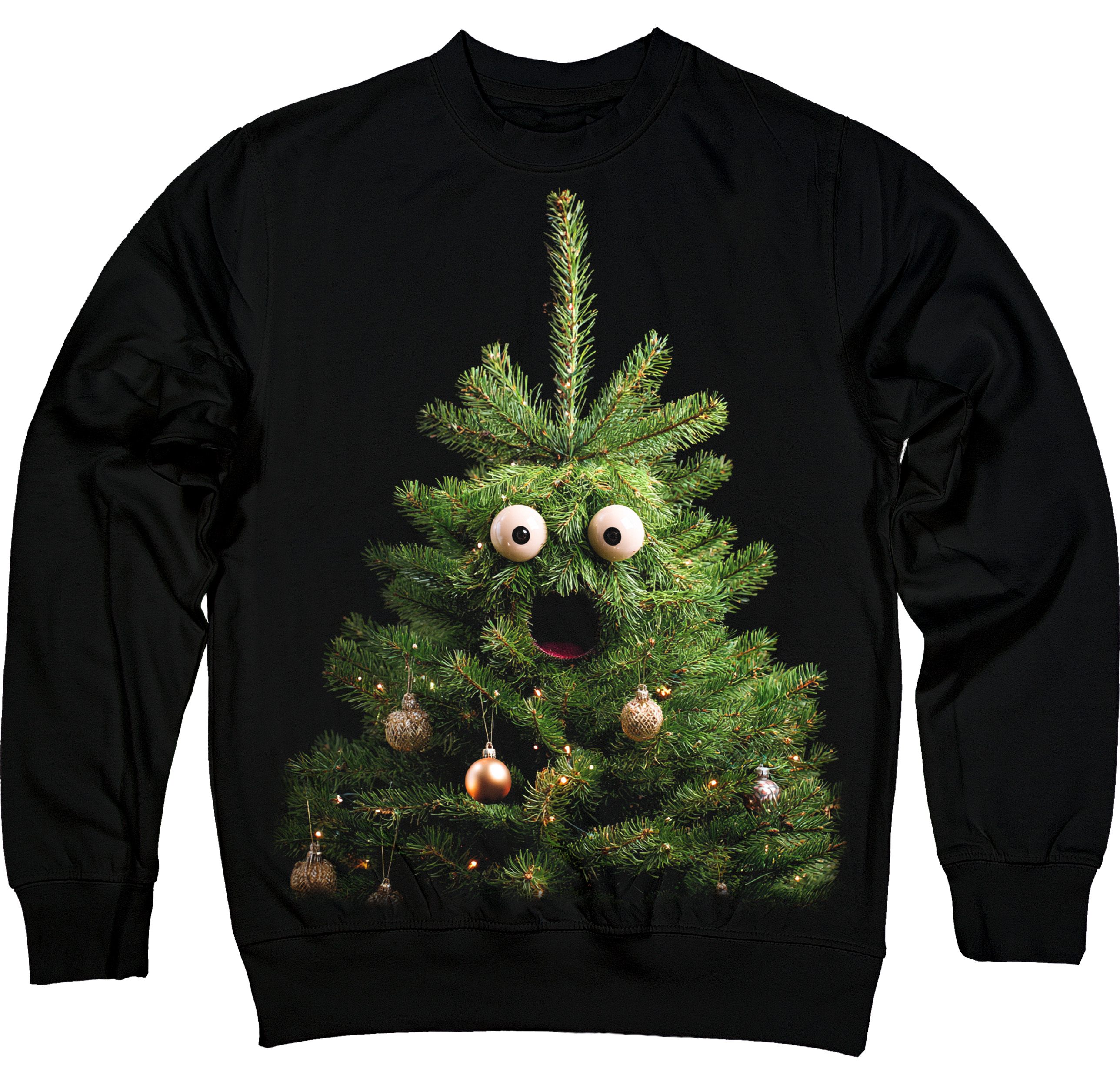 Ця новорічна ялинка — справжній мем у світі святкового одягу. Усміхнена, очманіла та максимально здивована, вона виглядає так, ніби тільки-но дізналася, що подарунки потрібно купувати сьогодні. Золоті іграшки, теплі вогники й густі зелені гілки створюють веселий настрій, а гротескні очі та відкрита паща роблять принт по-справжньому унікальним. Ідеальний светр для тих, хто хоче виглядати святково, але з хорошою часткою гумору.