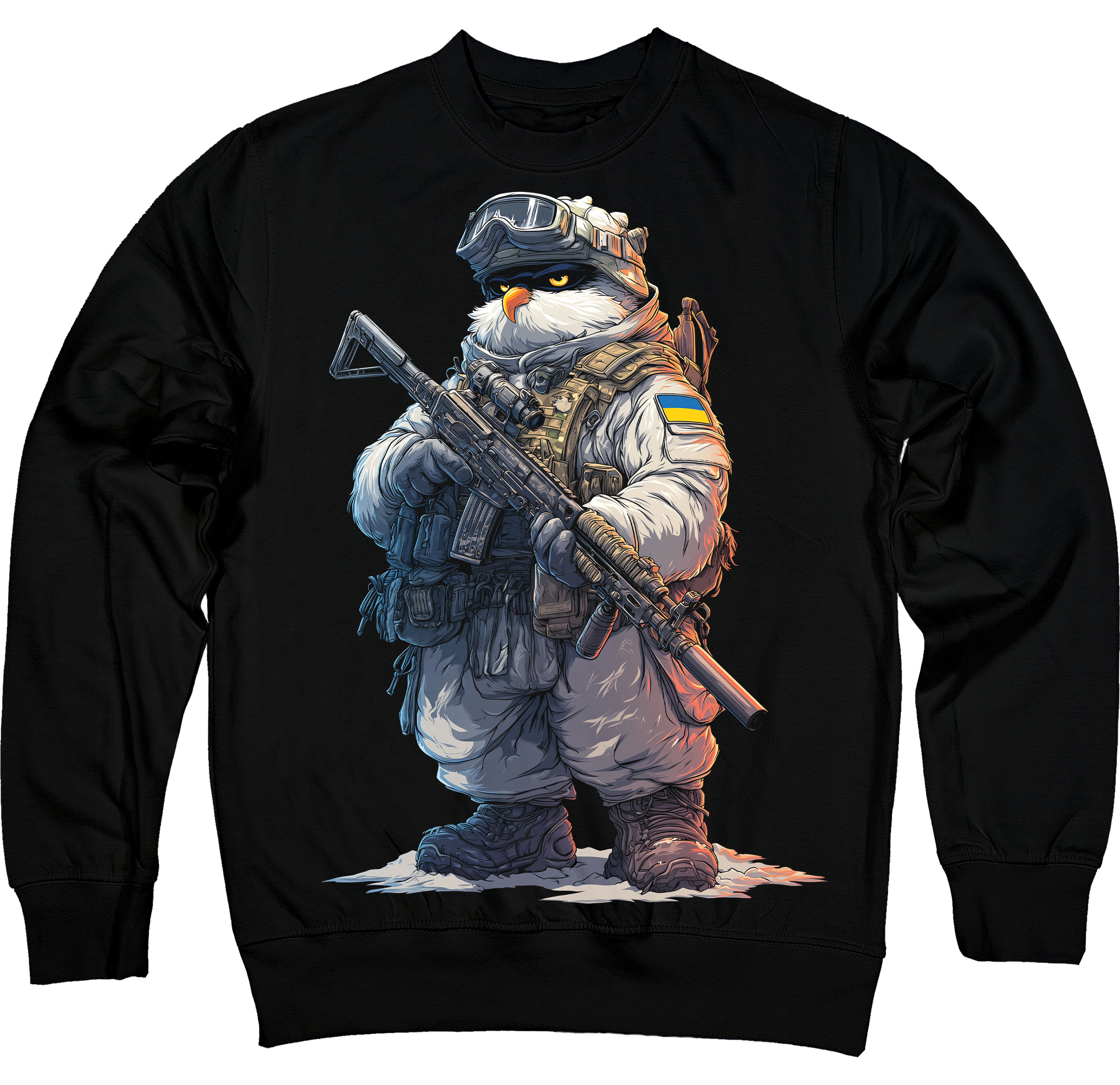 Пінгвін-розвідник у зимовому камуфляжі стоїть упевнено з гвинтівкою в руках. Тактичне спорядження, жовто-блакитний шеврон і суворий погляд створюють образ морозостійкого бійця з українським характером. Стильний, сміливий і трохи мультяшний дизайн для тих, хто підтримує ЗСУ.