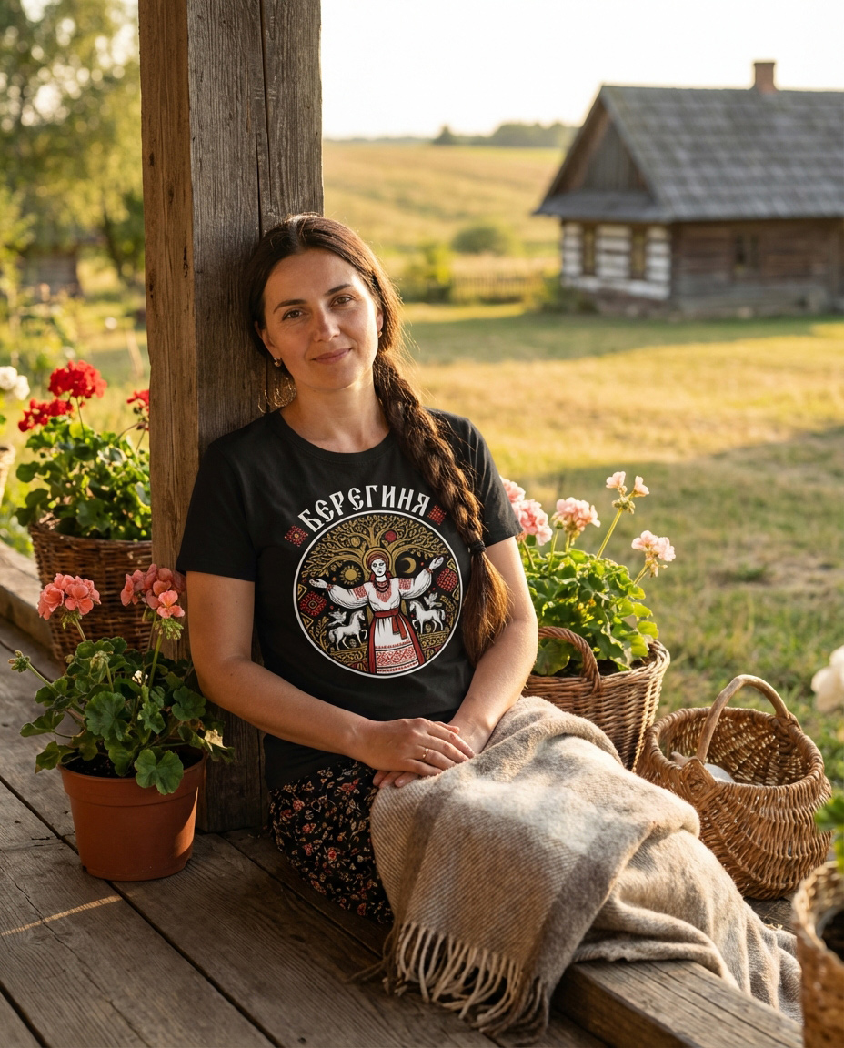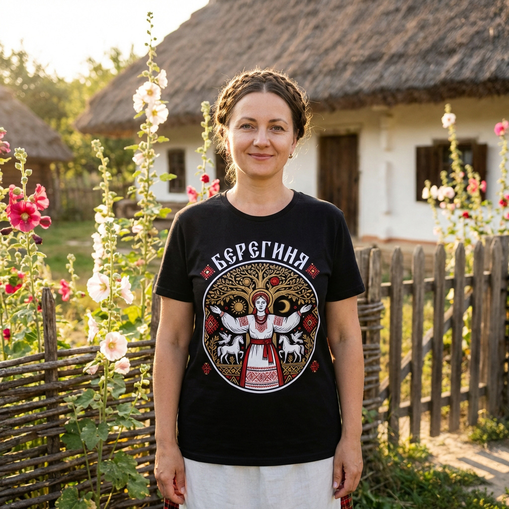 Футболка з образом Берегині — давнього символу захисту, життя та сили роду в українській міфології. Оберіг, що несе спокій і внутрішню стійкість.