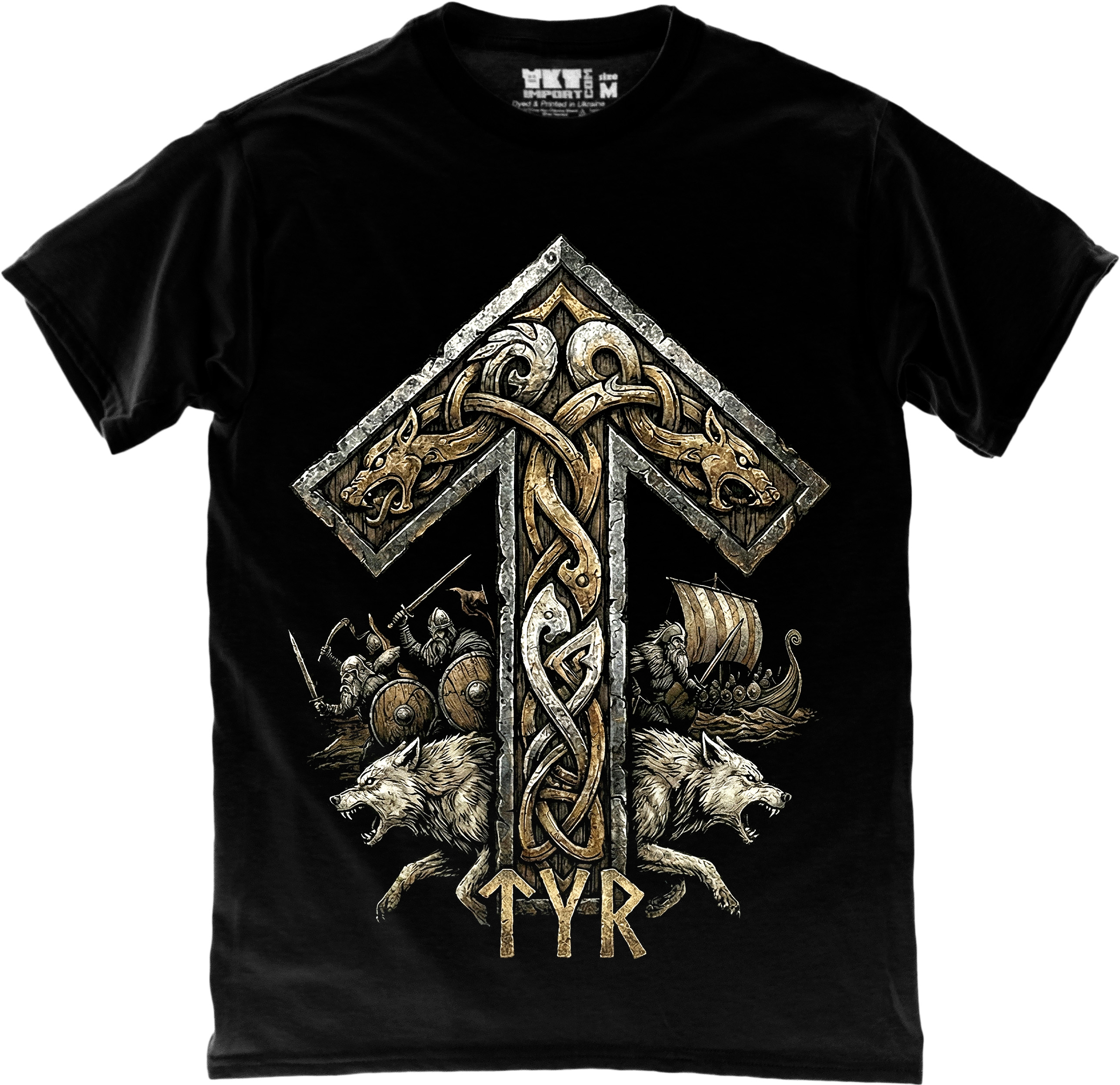 Футболка з руною Тіваз — символом воїнського шляху, честі та правильного вибору. Знак дисципліни й відповідальності в північній традиції.