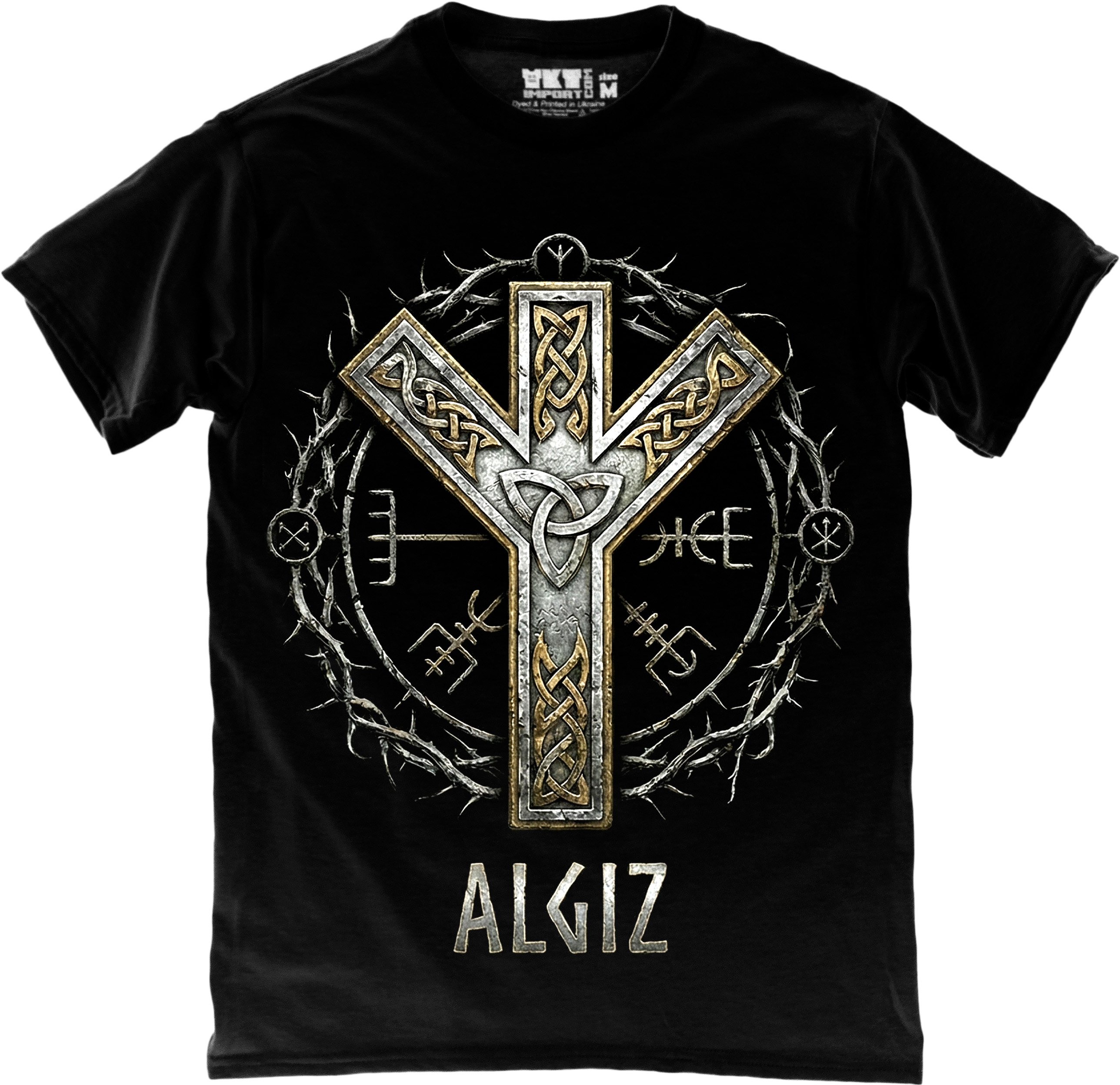 Футболка з руною Алґіз — знаком межі, що відокремлює загрозу від того, кого потрібно зберегти. Символ контролю, пильності та внутрішньої рівноваги.