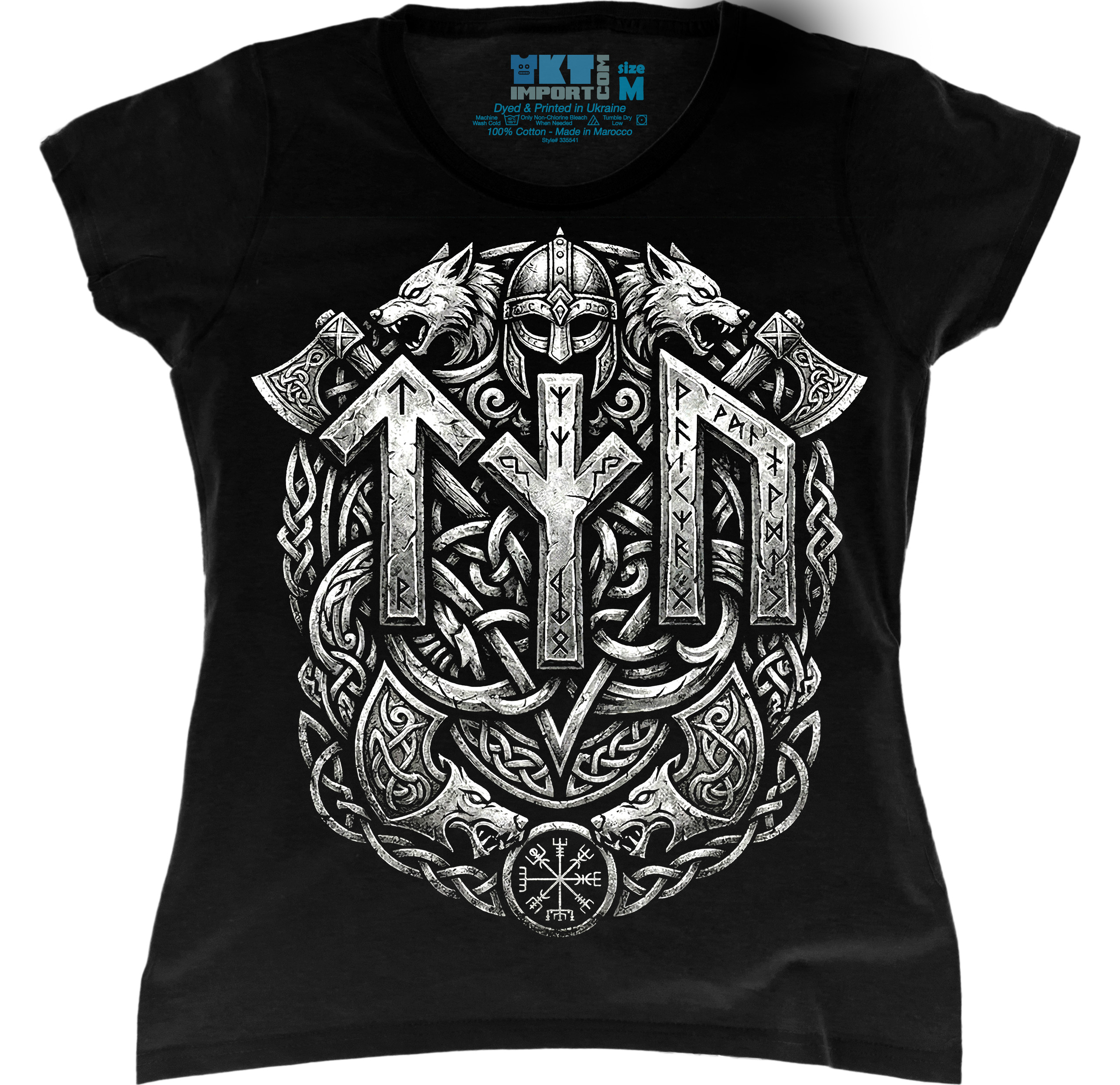 Жіноча футболка з композицією з рун Тіваз, Алґіз та Уруз — символів шляху, захисту та сили. Дизайн про внутрішню стійкість, усвідомленість і характер.