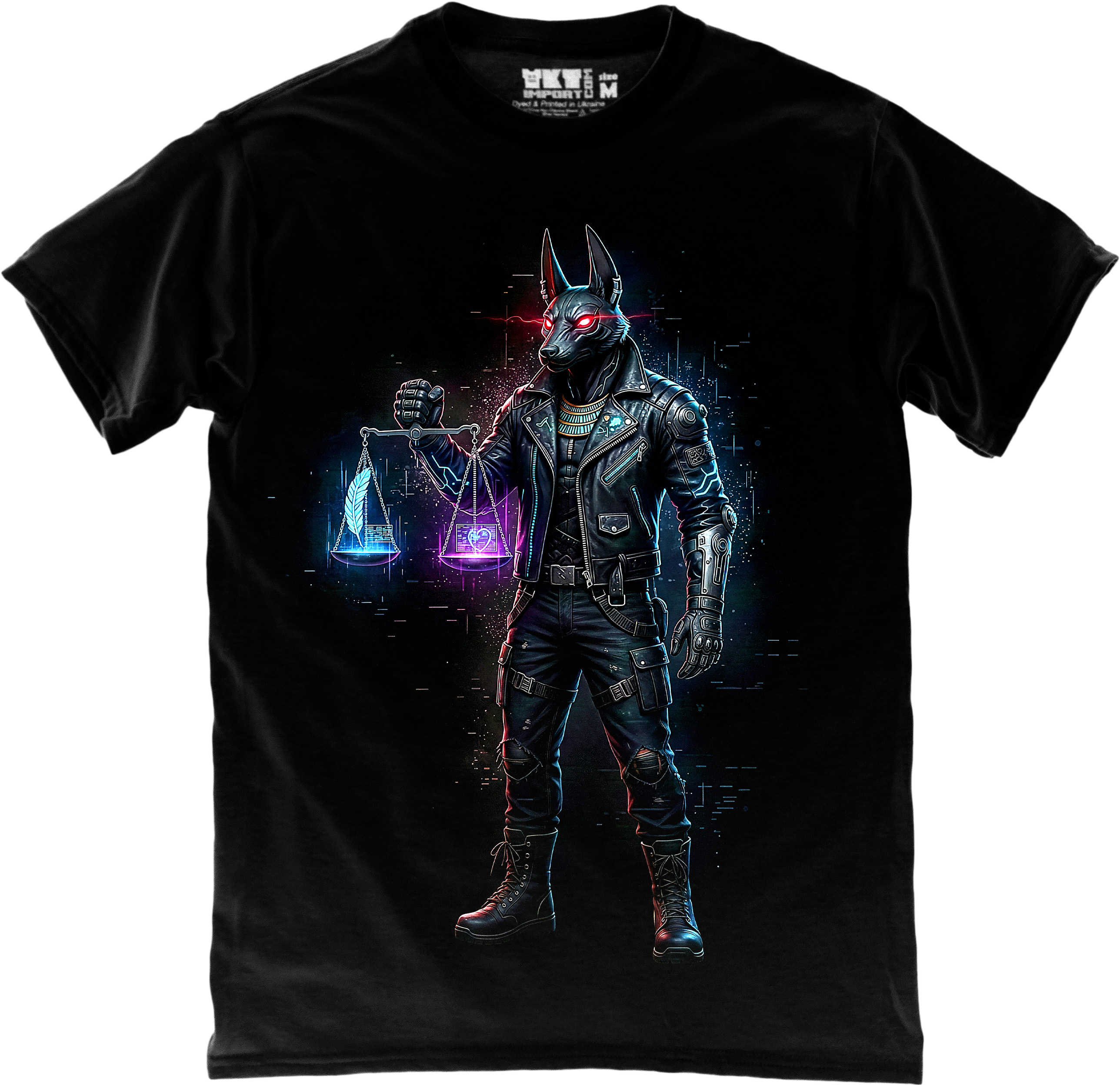 Футболка з футуристичним образом кібер-Анубіса — символу балансу, сили й цифрової ери. Неонові акценти та темна естетика створюють ефектний міський стиль.