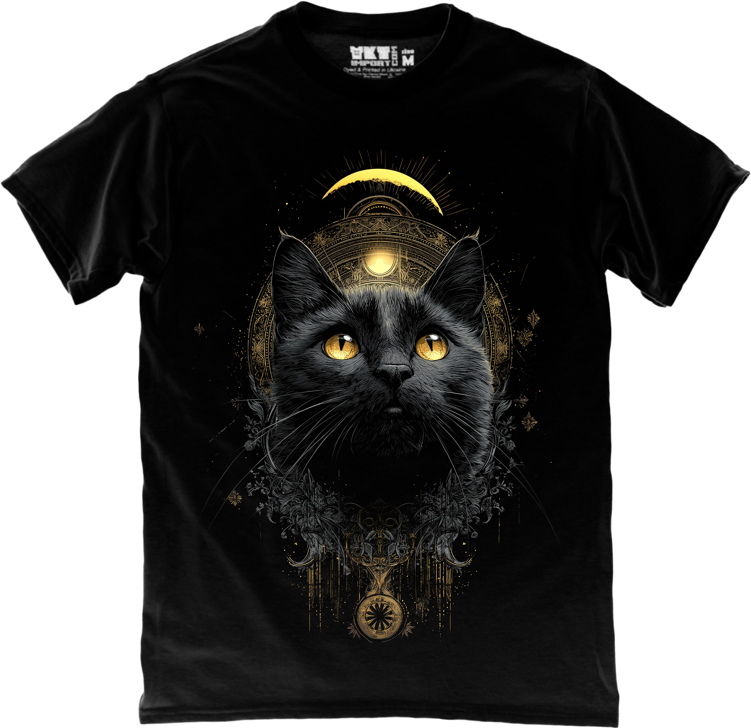 Чорний кіт із золотими очима на фоні містичних орнаментів і місяця — трохи магії, трохи загадки і максимум стилю.