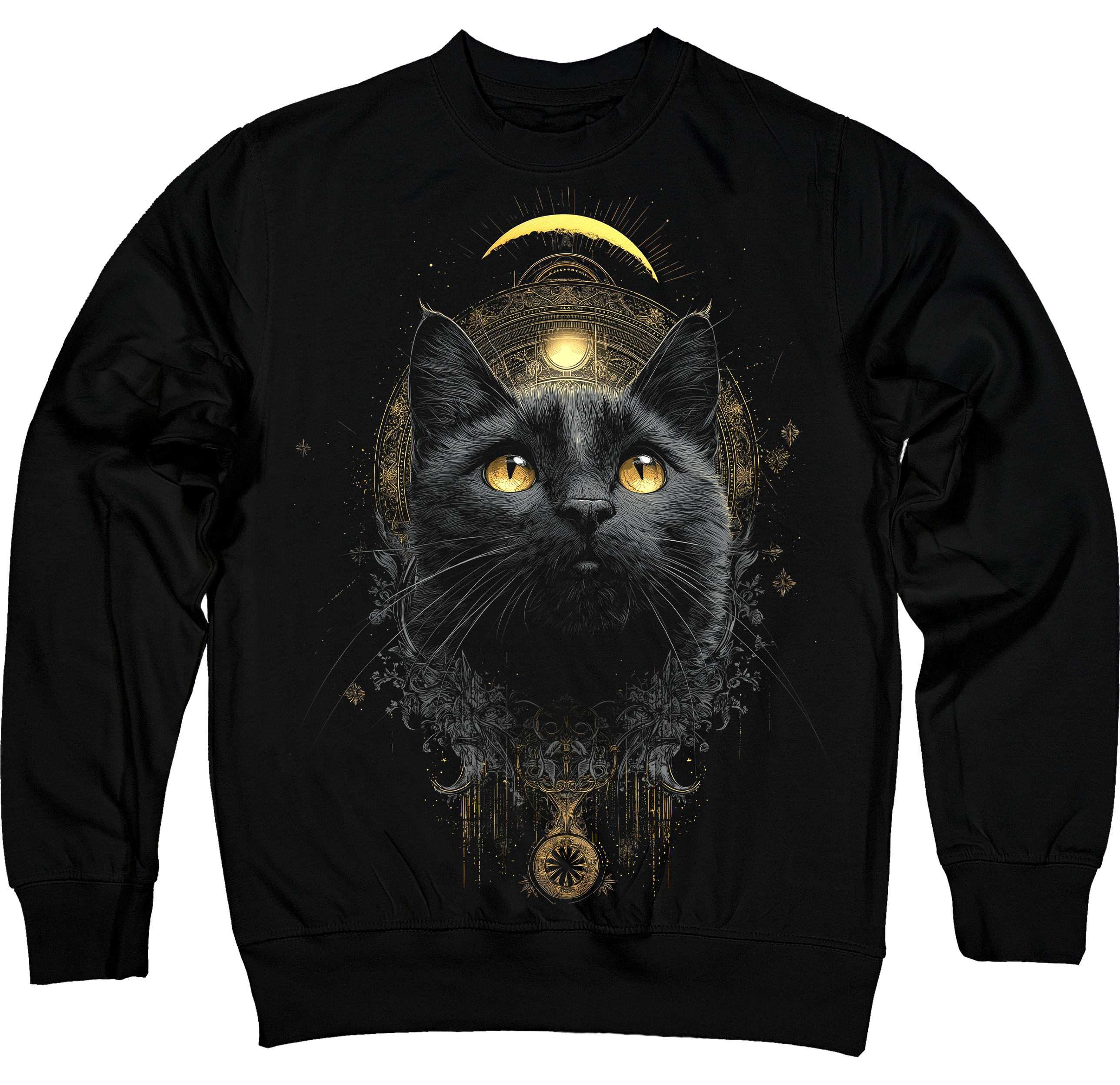Чорний кіт із гіпнотичним поглядом і декоративним орнаментом — одягнув і вже виглядаєш як людина з секретами.