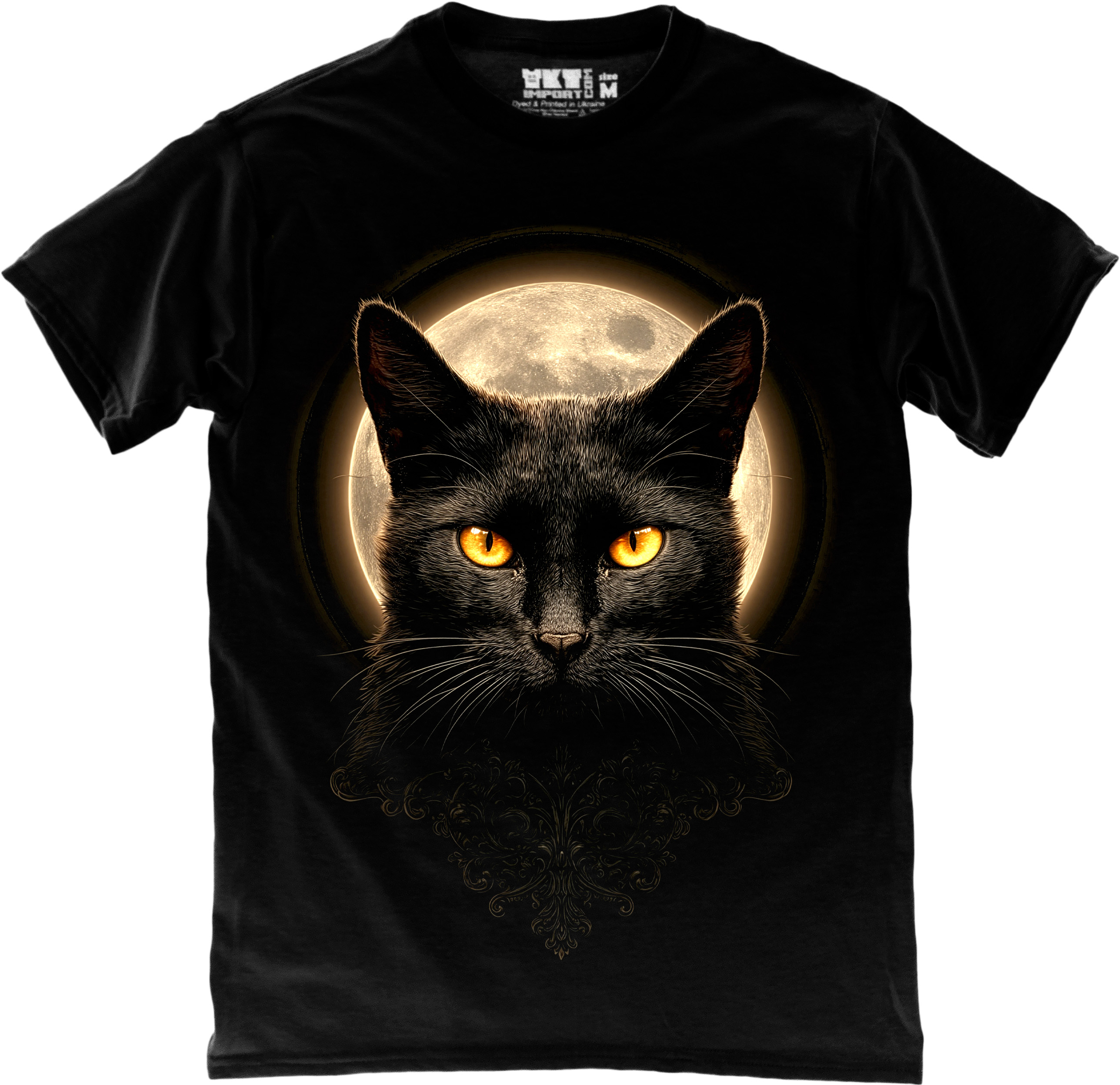 Стильна футболка з містичним принтом чорного кота на фоні повного місяця. Яскраві золоті очі та глибокі темні відтінки створюють ефектний образ для тих, хто любить загадковий стиль.