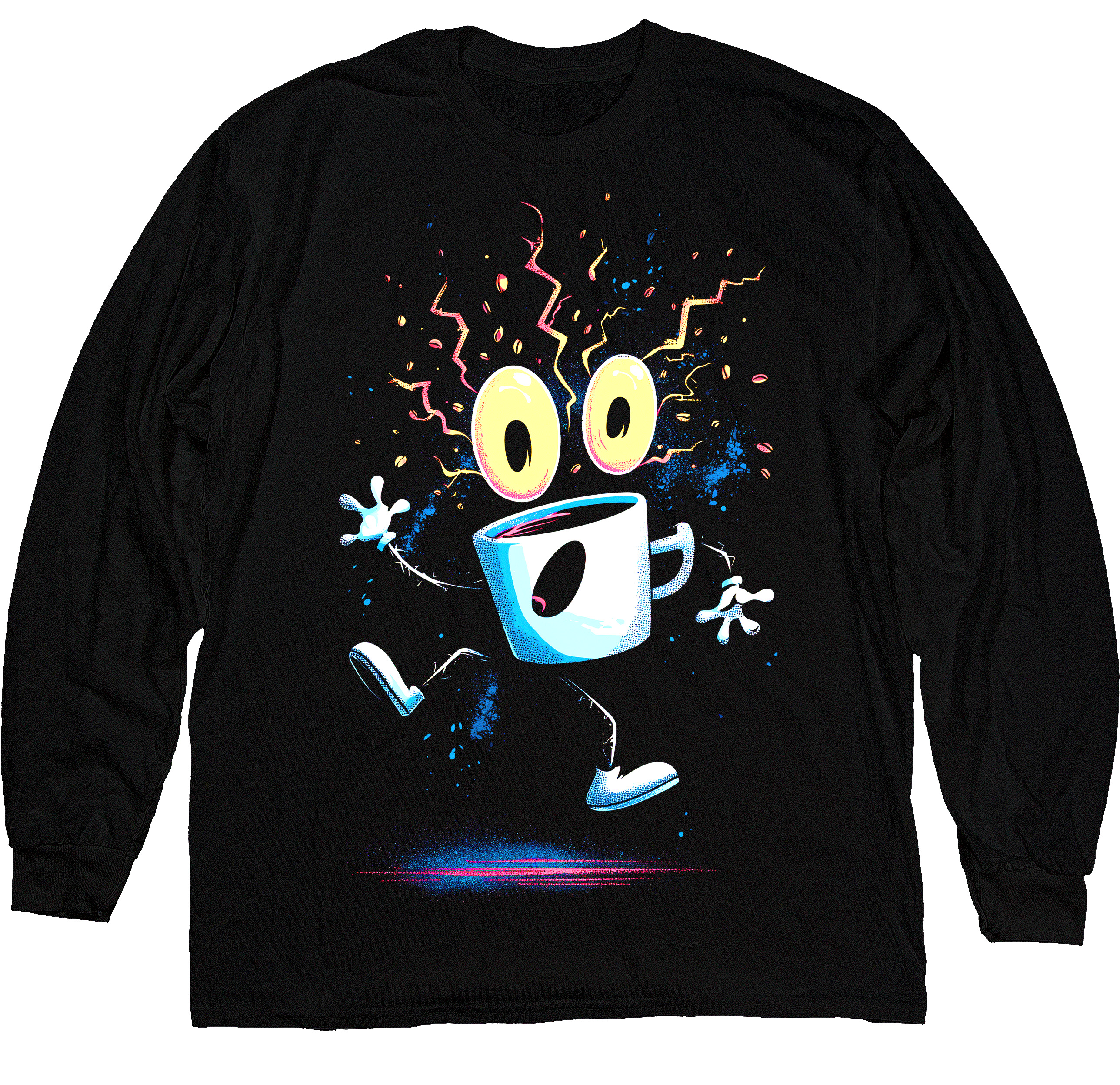 Стильний лонгслів із динамічним принтом шаленої чашки кави. Поєднує комфорт, легкий гумор і яскравий акцент для повсякденного образу.