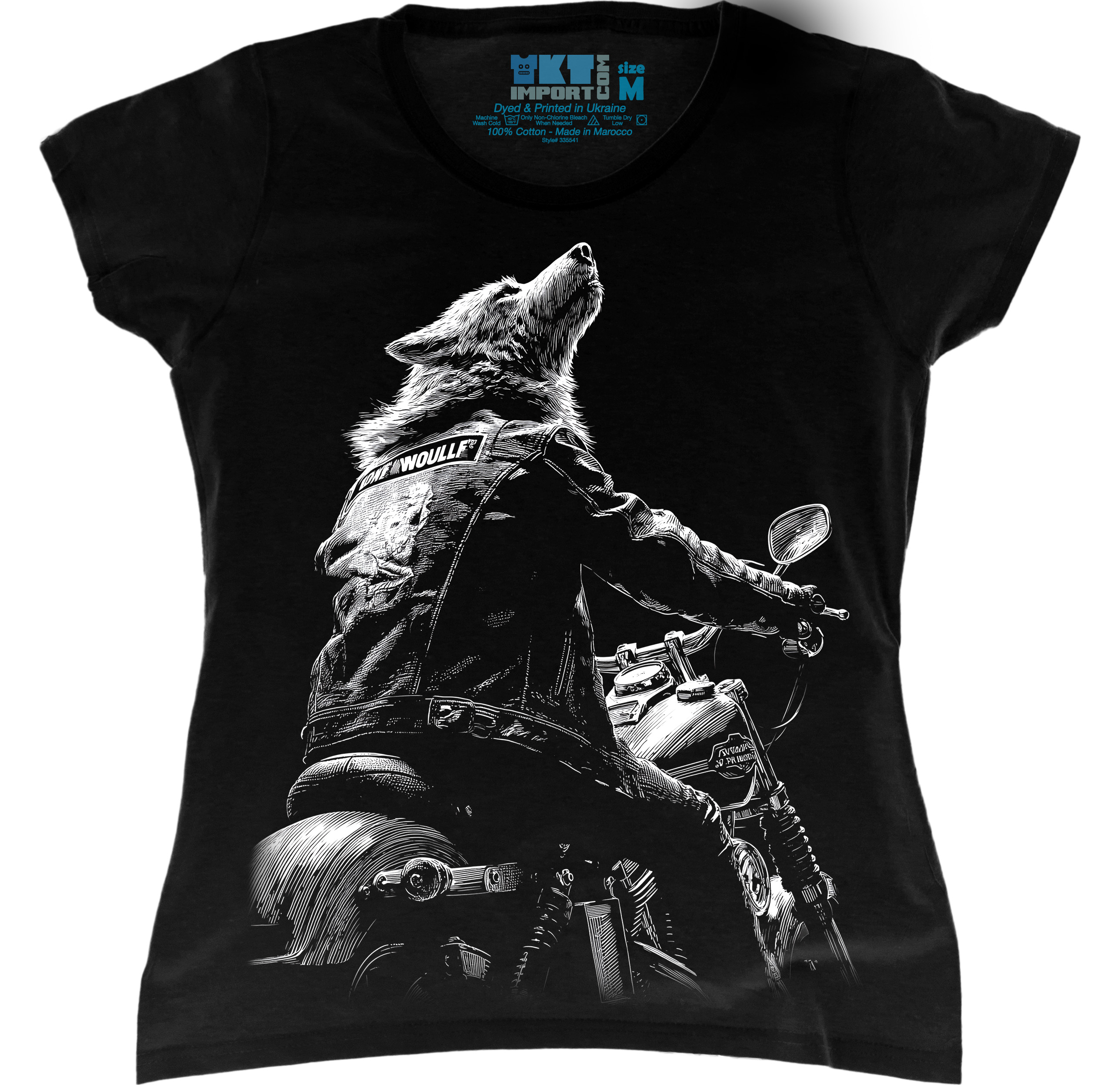 Жіноча футболка з ефектним принтом вовка на мотоциклі, що поєднує зухвалий стиль і символіку свободи. Модель виглядає яскраво, сучасно та привертає увагу з першого погляду.