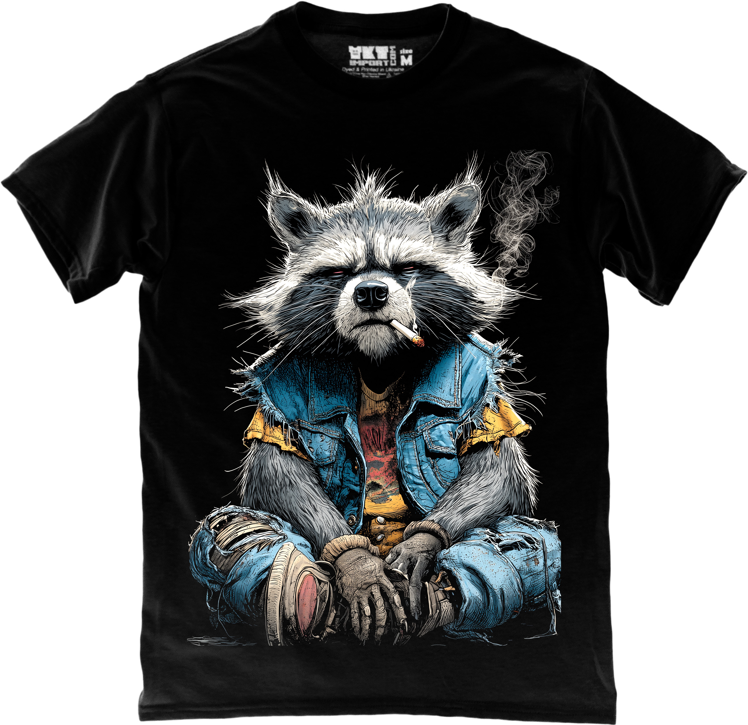 Стильна футболка з яскравим принтом харизматичного єнота у бунтарському образі. Дизайн одразу привертає увагу та чудово підходить для тих, хто любить сміливі речі з характером.