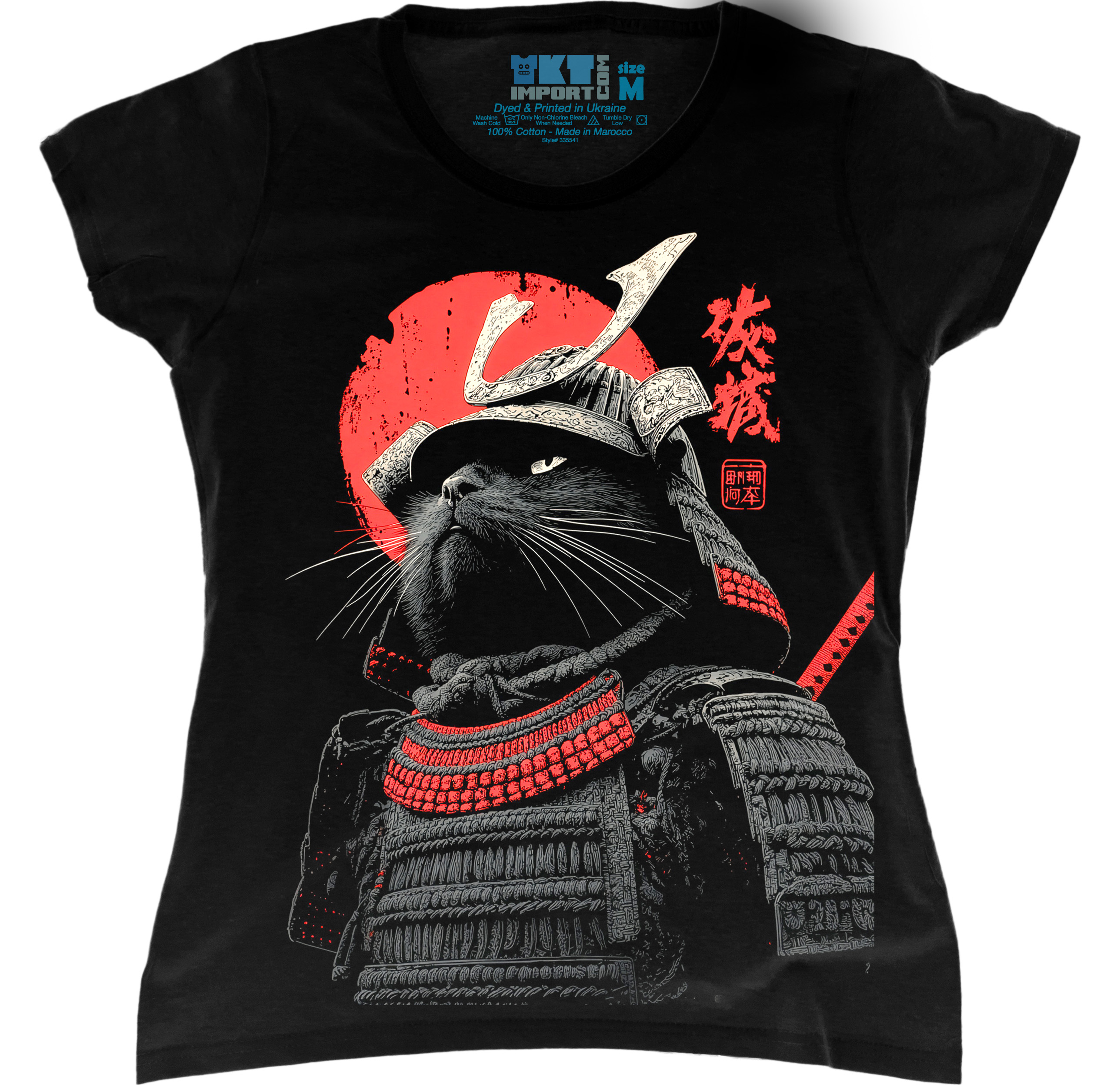 Жіноча футболка з ефектним принтом кота-самурая, що виглядає сміливо, стильно та дуже оригінально. Чудовий вибір для тих, хто любить яскраві речі з настроєм і характером.