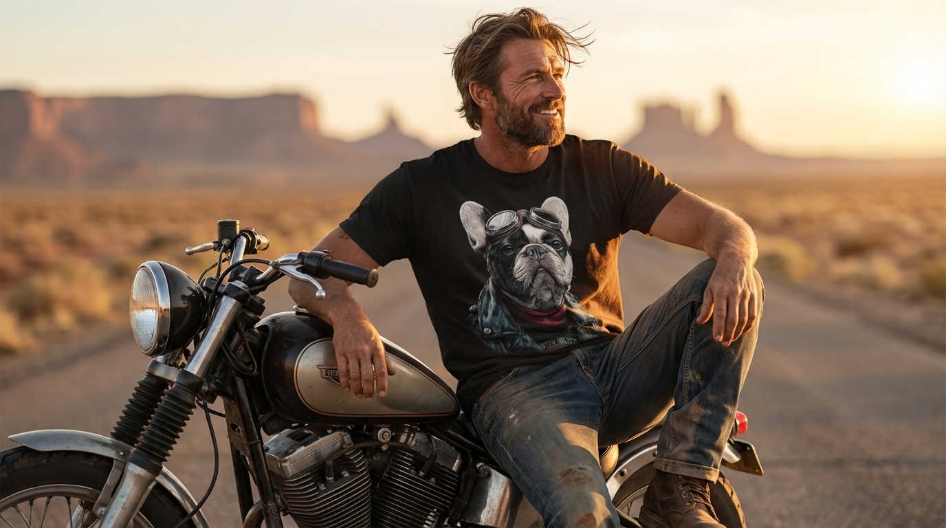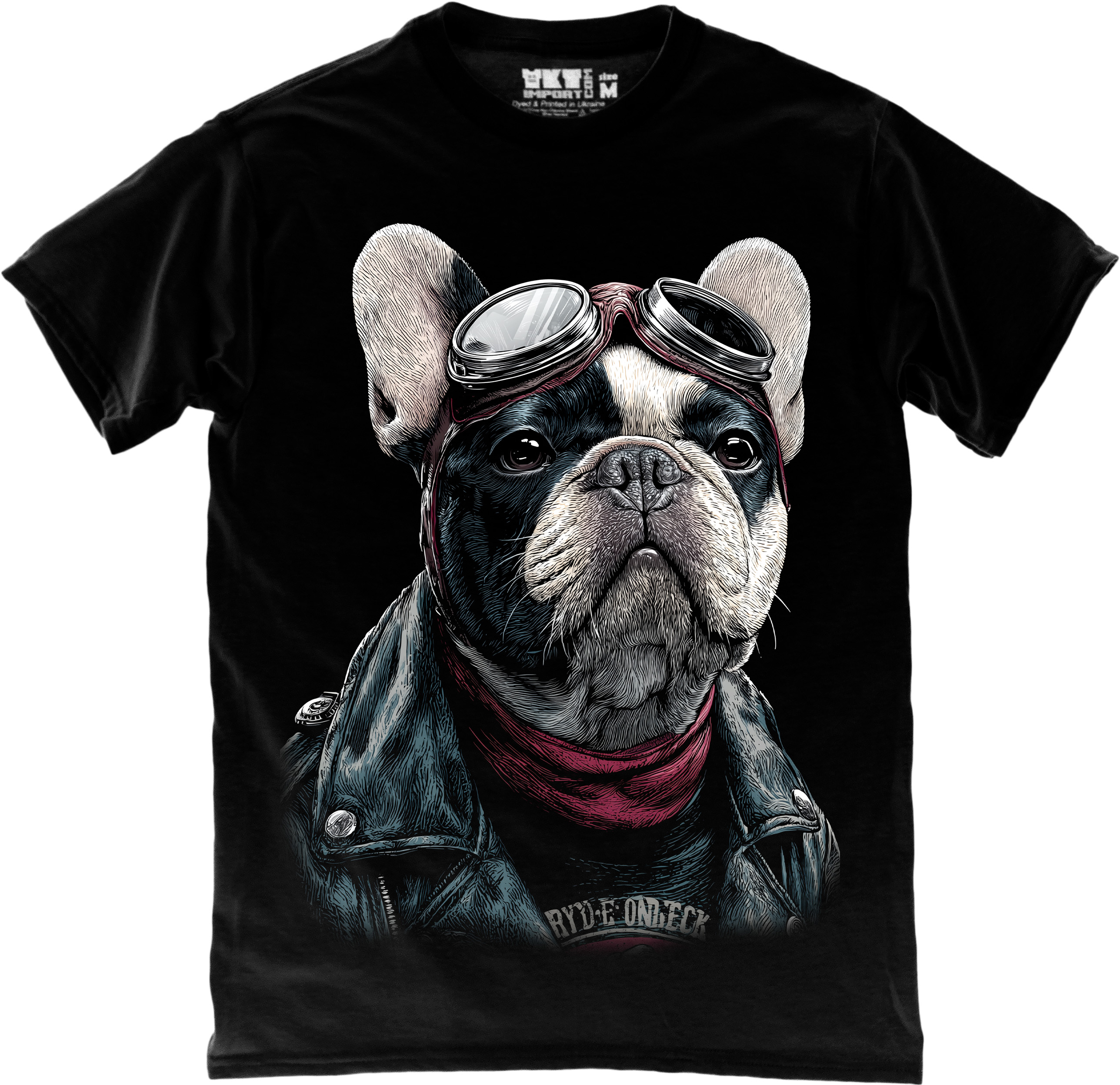 Стильна футболка з ефектним принтом французького бульдога в байкерському образі. Окуляри пілота, шкіряна куртка та харизматичний погляд створюють яскравий дизайн із характером.